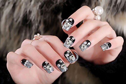 ホットピンクのラインストーンリボンが輝く!ゴージャスなクラウンモチーフデコレーションネイルチップ 王冠モチーフ ホワイトピンクラメベース アートチップ つけ爪 24枚組セット (ブラック)