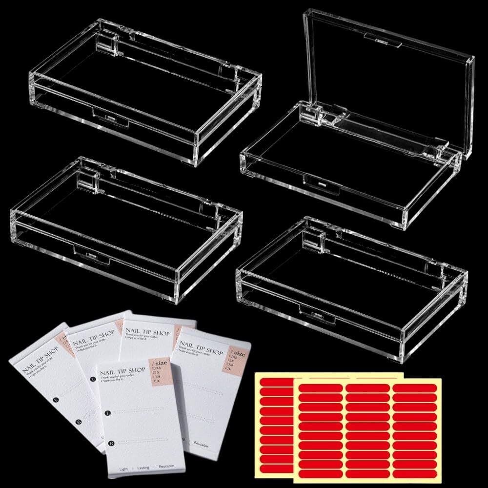 【商品仕様】:素材:プラスチック、外寸:長さ11.5cm*幅7.5cm*高さ2.2cm、内寸:長さ10.8cm*幅6.3cm*高さ1.1cm、セット内容:4個(展示カード*8枚➕️フィルムテープ付き)(✿✿ご注意:このセットにはネイルチップが含まれません!✿✿)