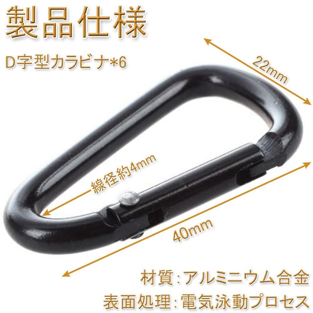 【製品仕様】D字型カラビナ*6;サイズ:長さ約40mm、幅約22mm、線径約4mm;材質:アルミニウム合金;表面処理:電気泳動プロセス;色:黒