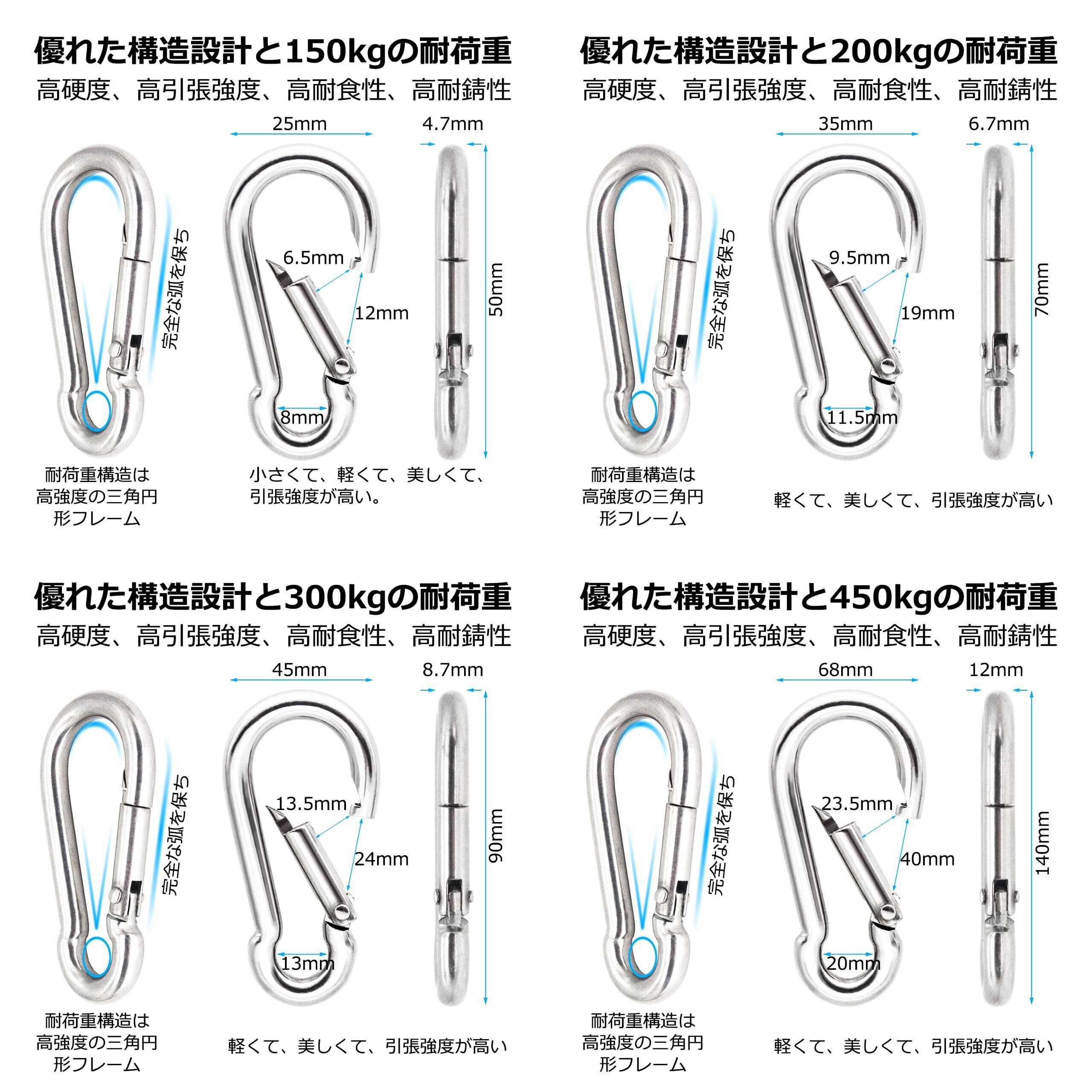 【優れた構造設計】:①耐力構造は高強度の三角形と円形のフレームである。 ②バネと主構造の間は完全な弧を保ち、引っ張った時の口開き防止加工有り、ミスで綱が抜けにくい。 ③開口部を大きくして、直径7mm以下の挂け金具を開口部から出し入れしやすいようにしている。