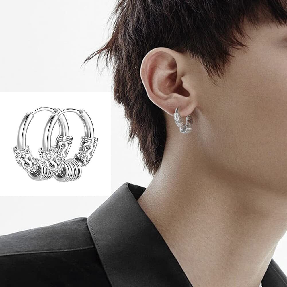 Rockyu フェイクピアス メンズ シルバー サージカルステンレス 小さめ 龍紋ピアス シンプル 4連リングピアス 黒 ボールピアス 両耳 12mm 14mm 16mm 軟骨ピアス ノンホール イヤーカフ 金属アレルギー対応 アクセサリー