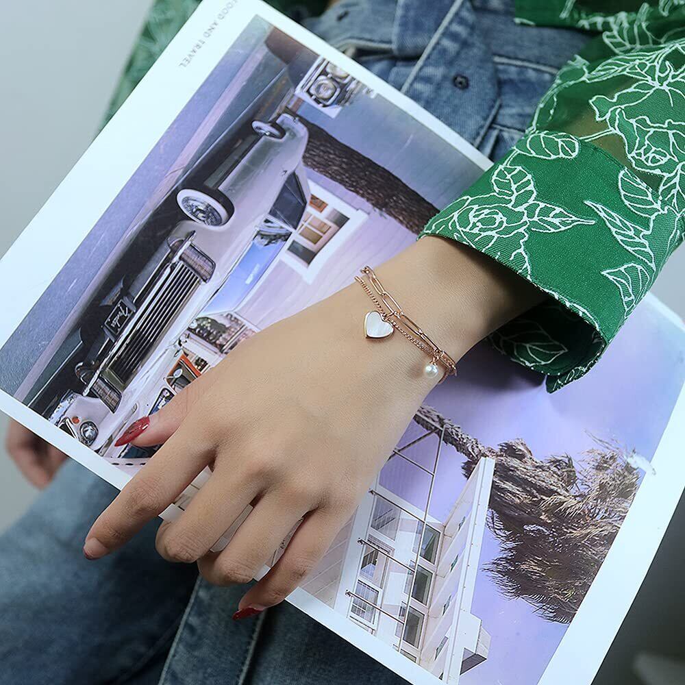 Deelfel ブレスレット シルバー レディース 白蝶貝 二連チェーン 心型 ハートブレスレット パール チタン製 金属アレルギー対応 パーティー 彼女 プレゼント ファッション アクセサリー バレンタインデー プレゼント