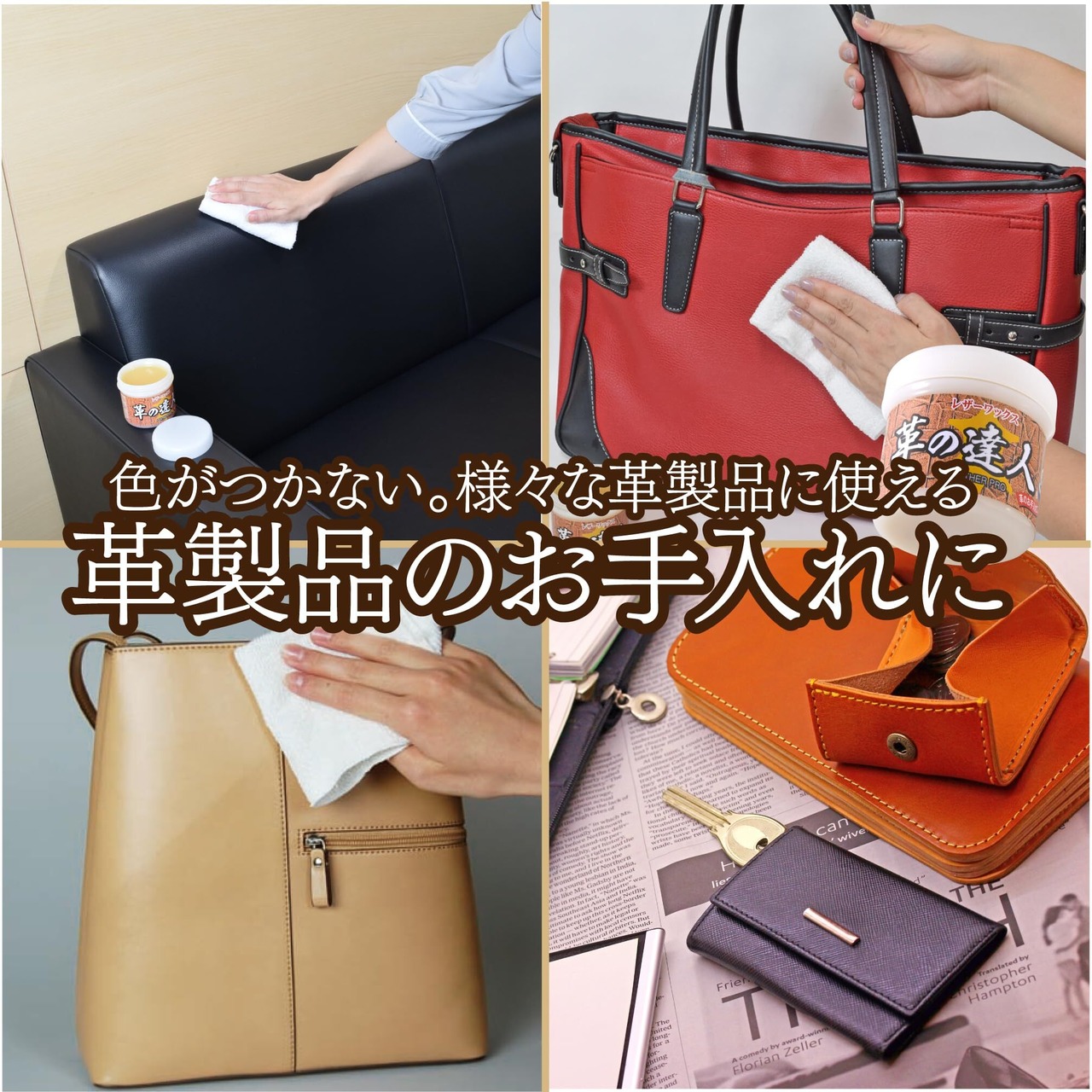 ●革製品全般、合成皮革の汚れ落とし・保護・艶だしに。但し、スエード、バックスキン、セーム革等、起毛素材のものには適していない