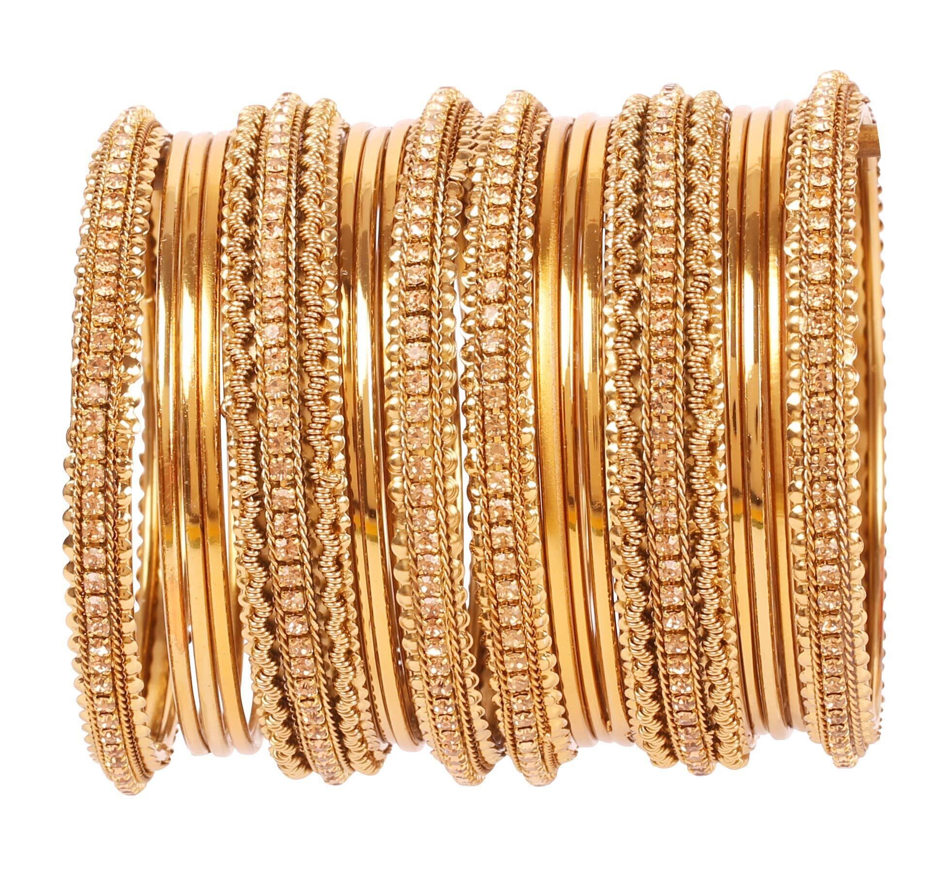 [Touchstone] 金色バングルコレクションエスニックスタイルスプリングワイヤ作業黄色シトリンラインストーンレデイーズ用アンティークゴールド調インドボリウッドデザイナージュエリー金属バングルブレスレット。 4セット。