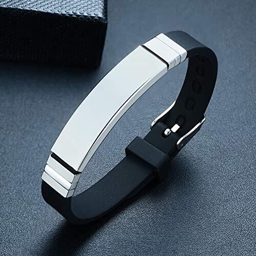 【Rockyu ブレスレット】シルバー ブラック 長方形プレートブレスレットプレートシリカゲルバングル 材料:ステンレス シリコン 寸法: チェーン15-21CM;プレート12*38MM 重量: 15.5g