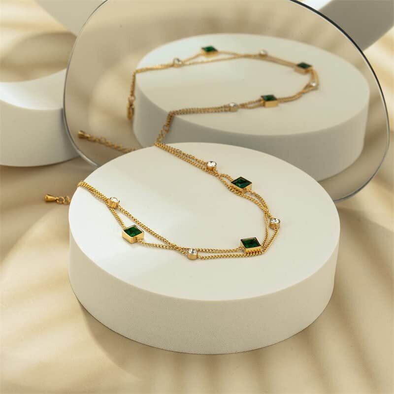 アンクレット レディース ステンレス つけっぱなし エメラルド 二連アンクレット 喜平チェーン ジルコニア 金属アレルギー対応 誕生日 パーティー プレゼント ファッション アクセサリー