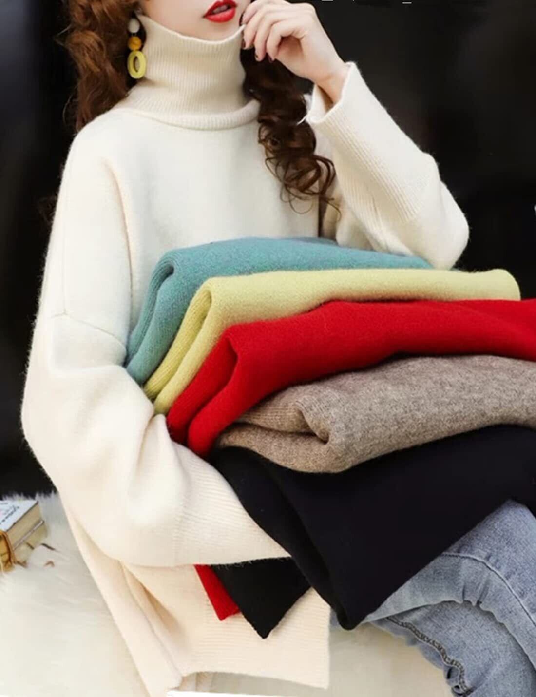 ☆春秋冬の定番アイテム、肌触りの良いハイネック ニットセーターが登場!素材:アクリル80%/ポリウレタン20% フリーサイズ:着丈66cm バスト110cm 袖丈50cm 伸縮性:あり