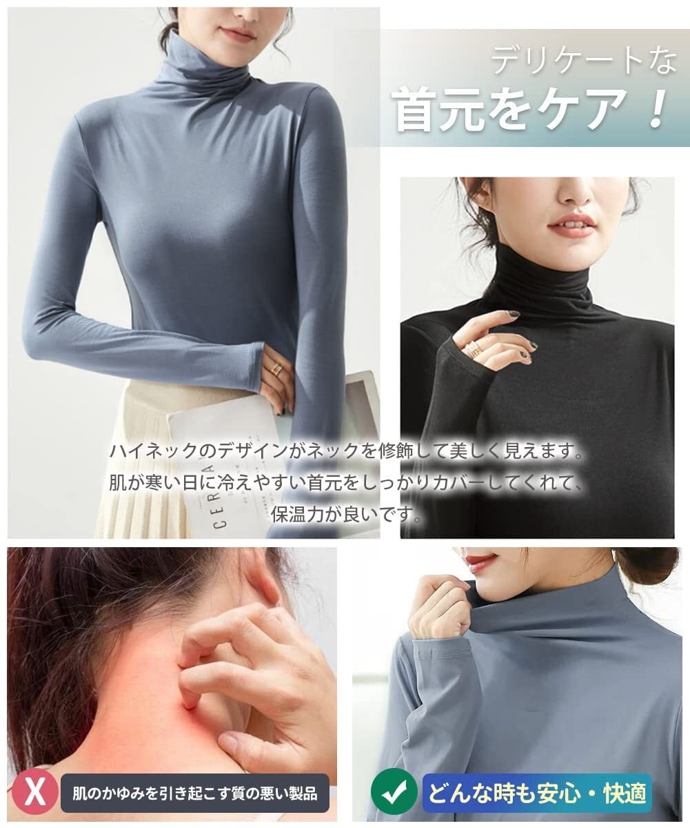 【ハイネックトップス・小顔効果抜群】ハイネックインナートップスのシルエットが首もとは主張すぎず、すっきり着れて顔周りを小顔に見せてくれます。ミルク繊維がボディのやさしくフィットし、メリハリのある女性らしい着こなしになります。また、ネック部分は冷たい風に侵入を防止、素材も柔らかいので首周りは絞めつけもなく暖かく心地いいです。