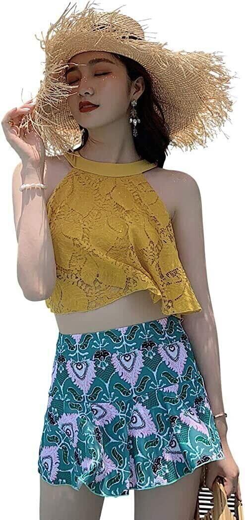 [YOUHA] 水着 体型カバー レディース ハイネック ビキニ スカート 2点セット レディース 水着 レース 無地 上下別柄 シンプル バックシャン かわ いい セクシー ノンワイヤー パッド付き