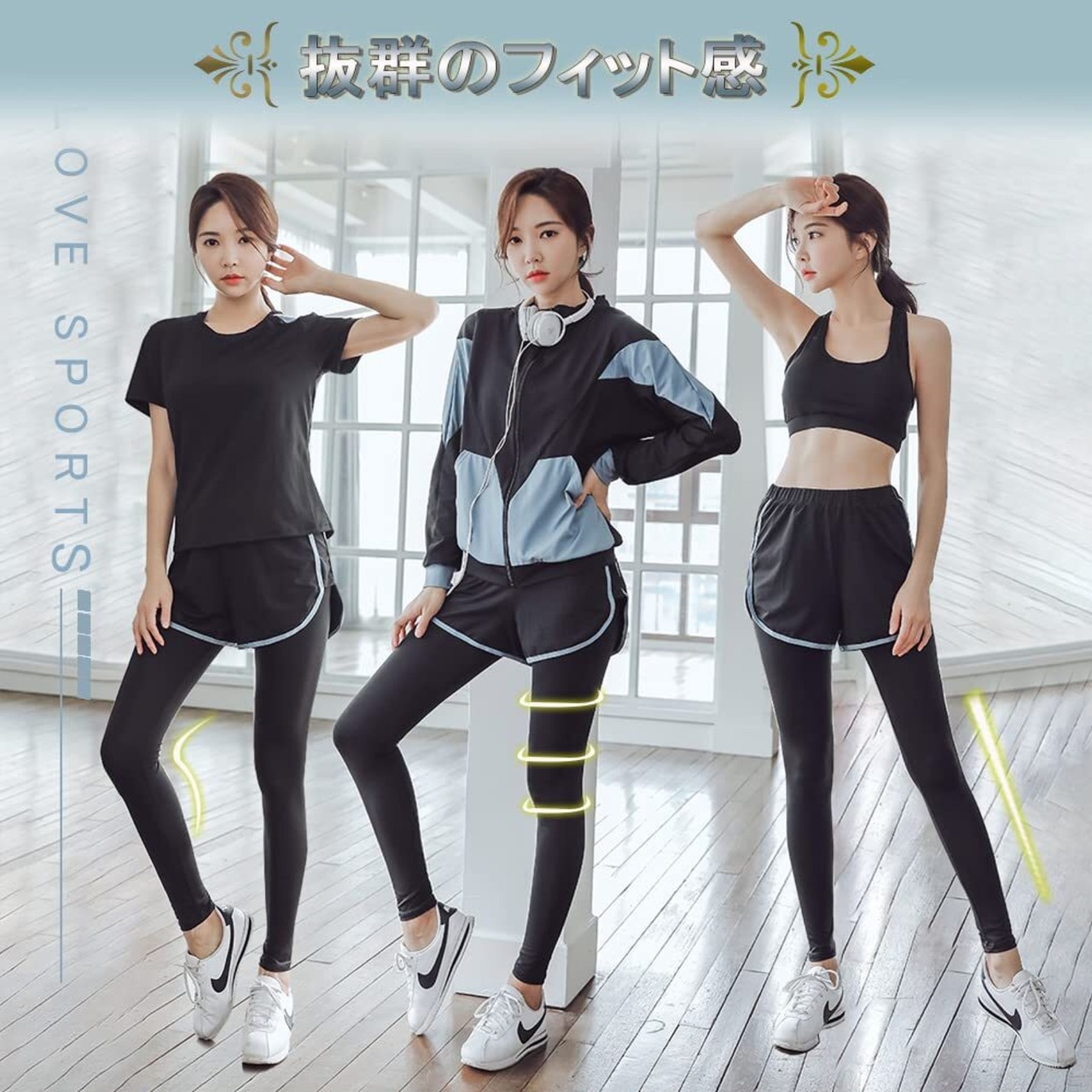 [DawnRain] スポーツウェア レディース ヨガウェア トレーニングウェア ランニングウェア 上下 5点セット 伸縮性 通気 吸汗速乾 フィットネス ジャージ スポーツブラ ロングタイツ パーカー 半袖 短パンツ 春夏秋冬