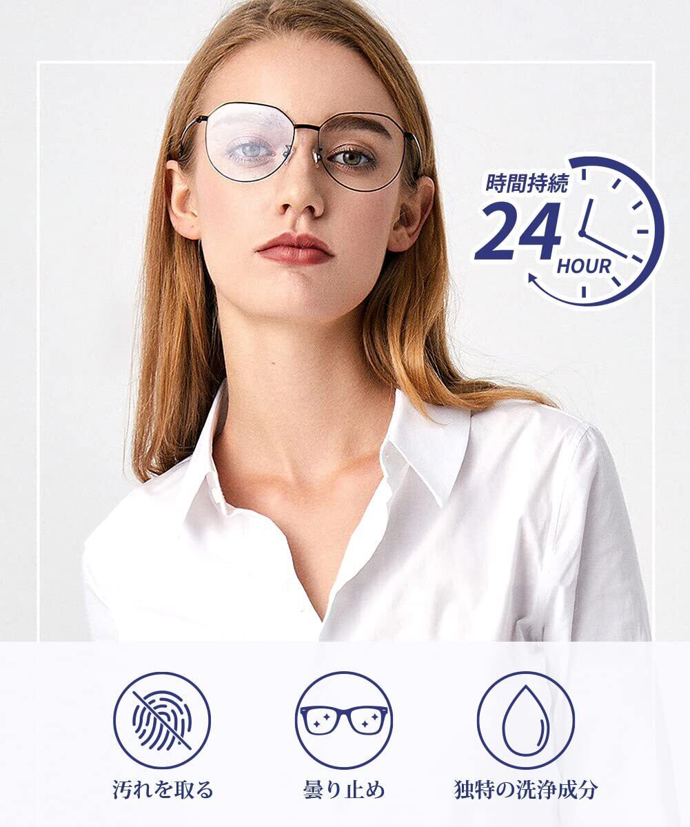 【長時間効果持続】正しい使い方で1回に拭けば、24時間ぐらいは視界が遮られることもなくなり、快適に過ごすことができます。※使用環境により効果・持続時間が異なります。レンズの表面にはくもり止め被膜がもうあったり、メガネ拭きが水に濡れたり、メガネクリーナーが密閉に保管してなかったり、以上の状況によってはくもり止め効果が低下になる可能性があります。