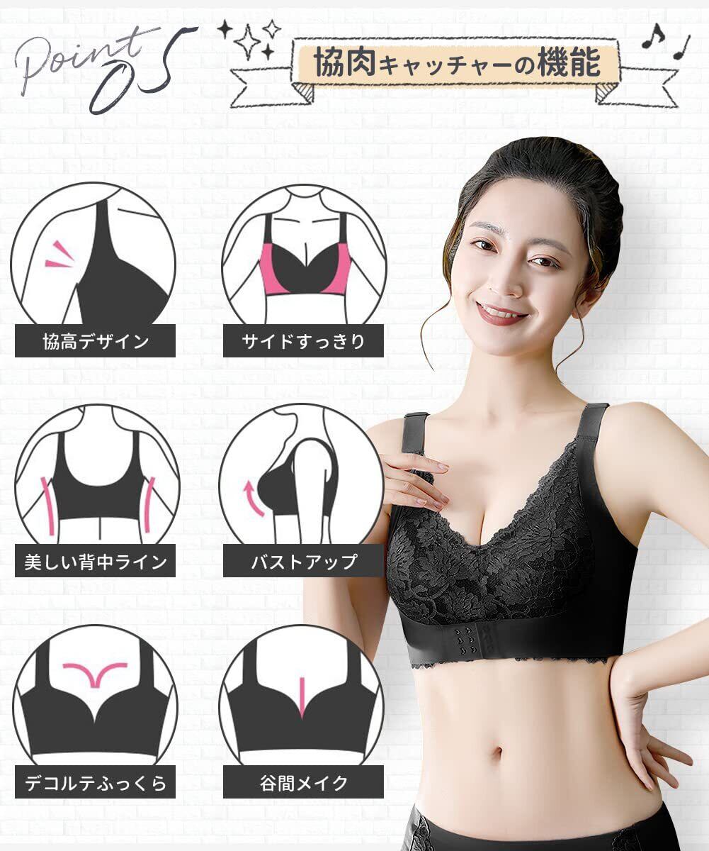 【理想の形を作るホールド構造】幅広の柔らかい肩ひもを固定して、高い弾力、肩の圧力がなく、肩の疲れ感や痛みを緩和します。胸下の 補正ひもは柔らかくて良いほど着圧、バストを締め付けすぎず、つけた瞬間谷間UP。睡眠中脇肉や背肉をバストに誘導しフロントホックでしっかりホールド。バストの横流れ・型崩れを防止し綺麗なバストラインを保ちます。