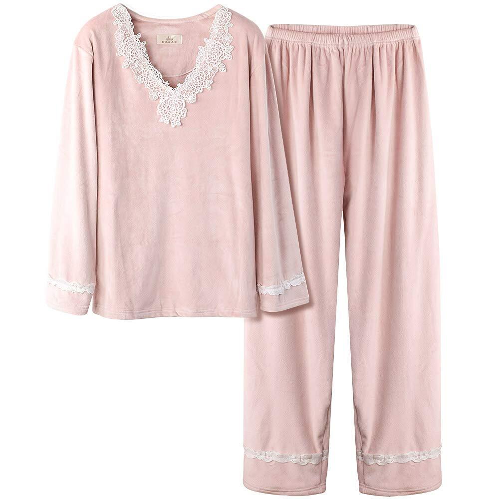 [ヒルトップクラウド] パジャマ レディース ルームウェア 裏起毛 長袖 もこもこパジャマ 部屋着 ゆったり 上下セット レース付き 二重起毛 あったか 厚手 柔らかい 吸湿 保温 秋冬用