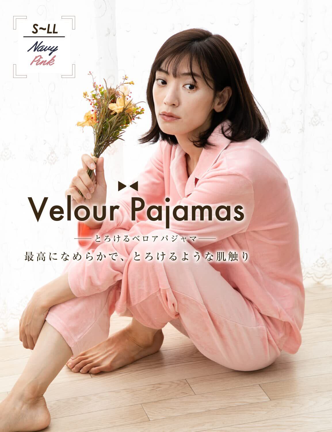 【なめらかで暖かいベロアパジャマ】シルクのようになめらかでやわらかい上質なベロア素材を使用しており、リラックスタイムにぴったりのレディースパジャマ。軽やかでおやすみの時も快適な睡眠へと導いてくるそんなレディースパジャマとなっております。表面はなめらかなベロア、肌に触れる裏面はサラッとした肌触りで真夏以外オールシーズン最適です。エレガントでフェミニンなパジャマで快適なおうち時間を過ごしてみませんか?