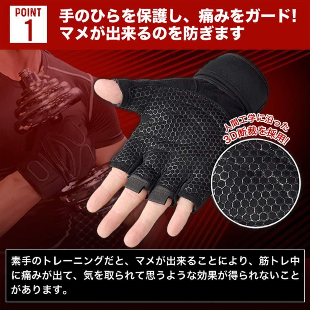 【ジムでの運動時に手~手首を保護】 ジムで、高負荷のウエイトトレーニングや筋肉トレーニングをする際に必須のアイテム、筋トレグローブです。表面は蜂の巣状の滑り止めを施してあり、安全なエクササイズが可能です。 手首部分にはリストフラップ付きなので、手首を補強し、怪我を未然に防ぎます。 また、手のひら部分にはクッション性の高い弾力性スポンジを採用。手を保護し、痛みをガード!マメが出来るのを防ぎます。 ベンチプレスやダンベルトレーニング バーベルを使ったトレーニングの際、握力が足りないのを保護する役割も果たします。 これから、ウェイトリフティングを始める方、フィジークやボディービルの大会に出る方にもお勧めの トレーニンググローブ です。