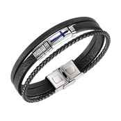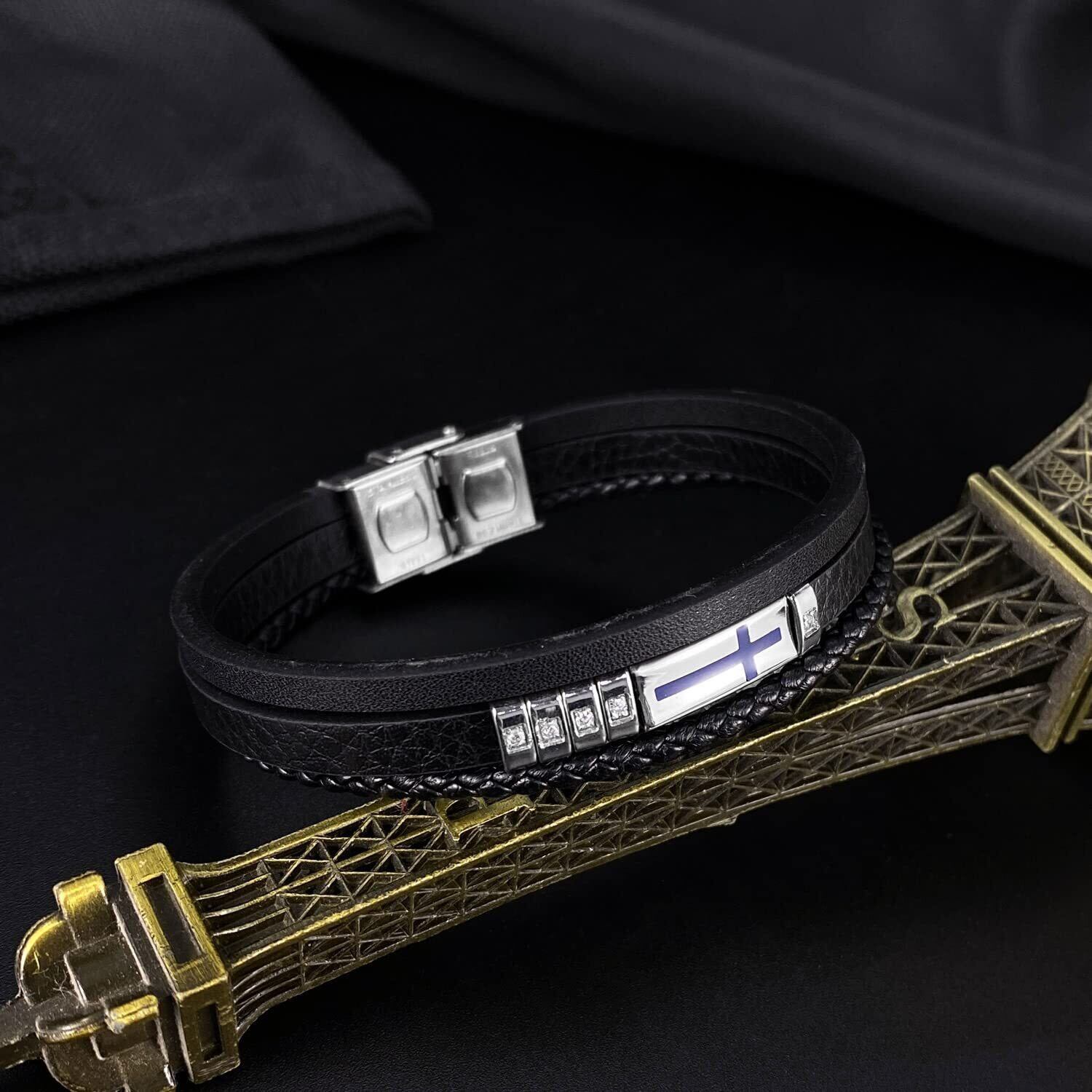 [Rockyu] ブレスレット メンズ レザー 本革 五連ジルコニア ブラック ステンレス金属アレルギー対応 ブルー 多層 十字架 プレートブレスレット三連チェーン アクセサリー