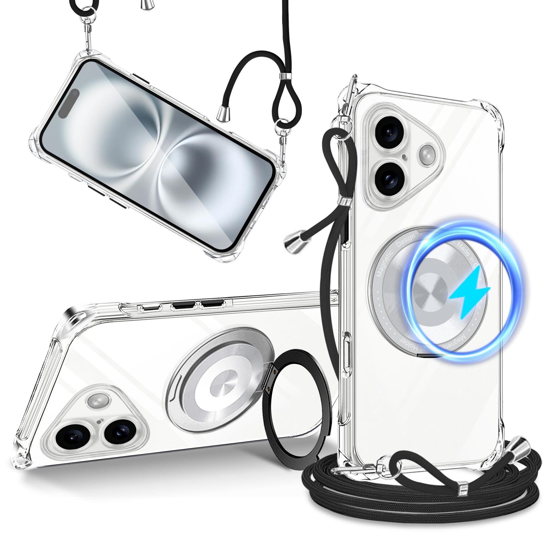 iPhone 16 ケース クリア 透明 MagSafe対応 マグセーフ ワイヤレス充電 リング付き スタンド機能 ストラップ付き 調節可能な ショルダー マグネット搭載 TPU シリコン ストラップホール付き アイフォン 16 カバー 肩がけ 首掛け 紐付き スマホケース ストラップホール付き 耐衝撃 全面保護 カバー(クリア)