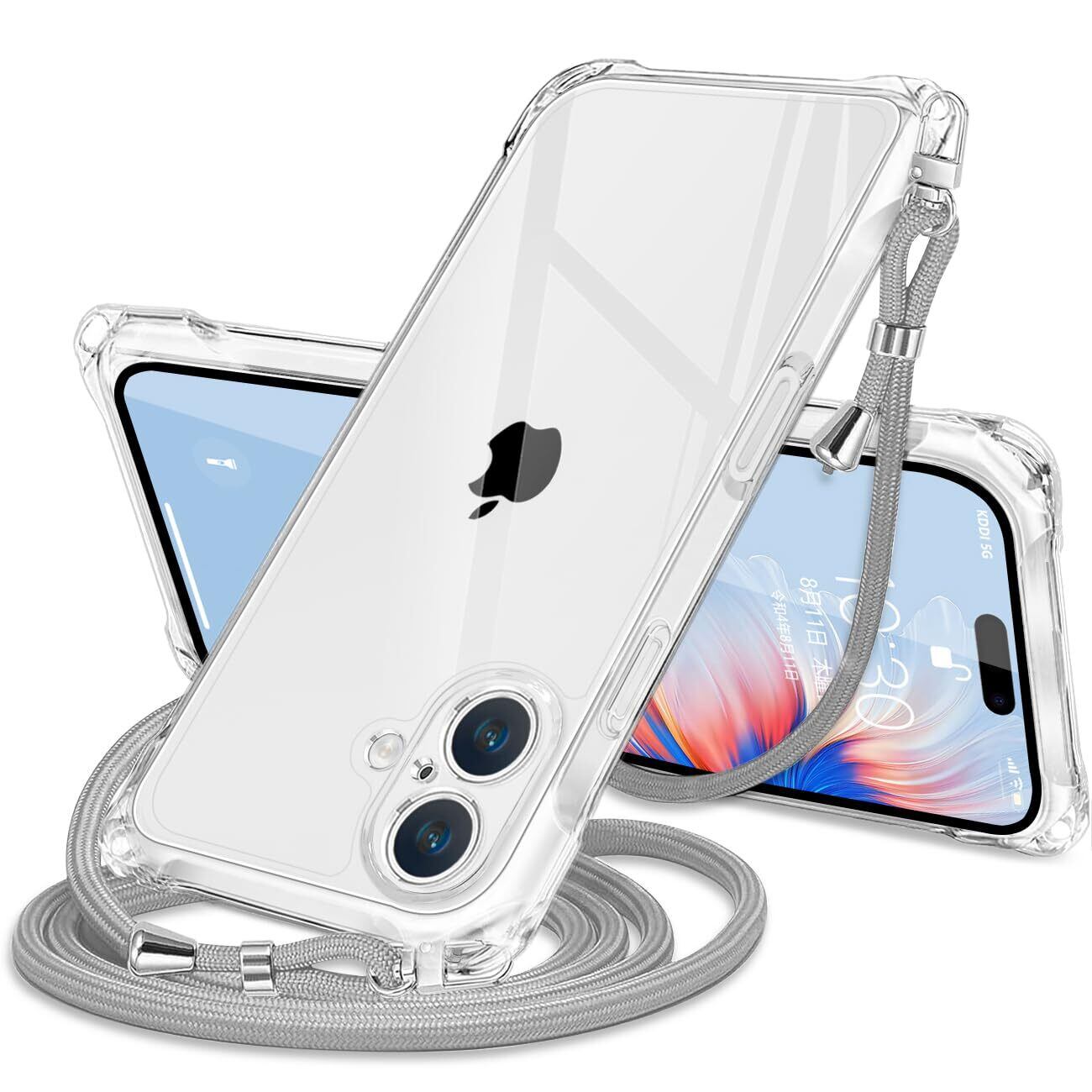 iPhone 16 ケース クリア 肩掛け斜めかけ 首掛け縄掛け アイフォン 16 カバー ショルダー 透明 カバー 耐衝撃 斜めがけ 縄掛け 長さ調整可能 薄型 落下防止 全面保護 縦/横 紛失防止 2WAY 可愛い Qi充電対応 (グレー)