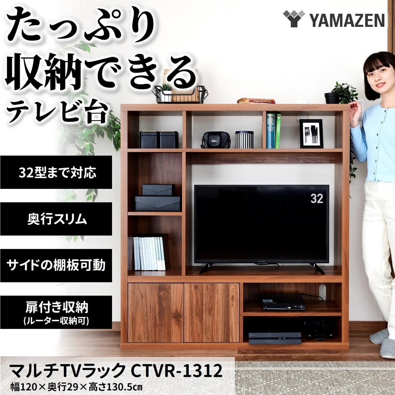 [山善] テレビ台 32型 ハイタイプ テレビボード 扉付き収納 (ルーター対応) 棚板可動 薄型 壁面収納 幅120×奥行29×高さ130.5㎝ ブラウン3D 組立品 CTVR-1312(BR3D)