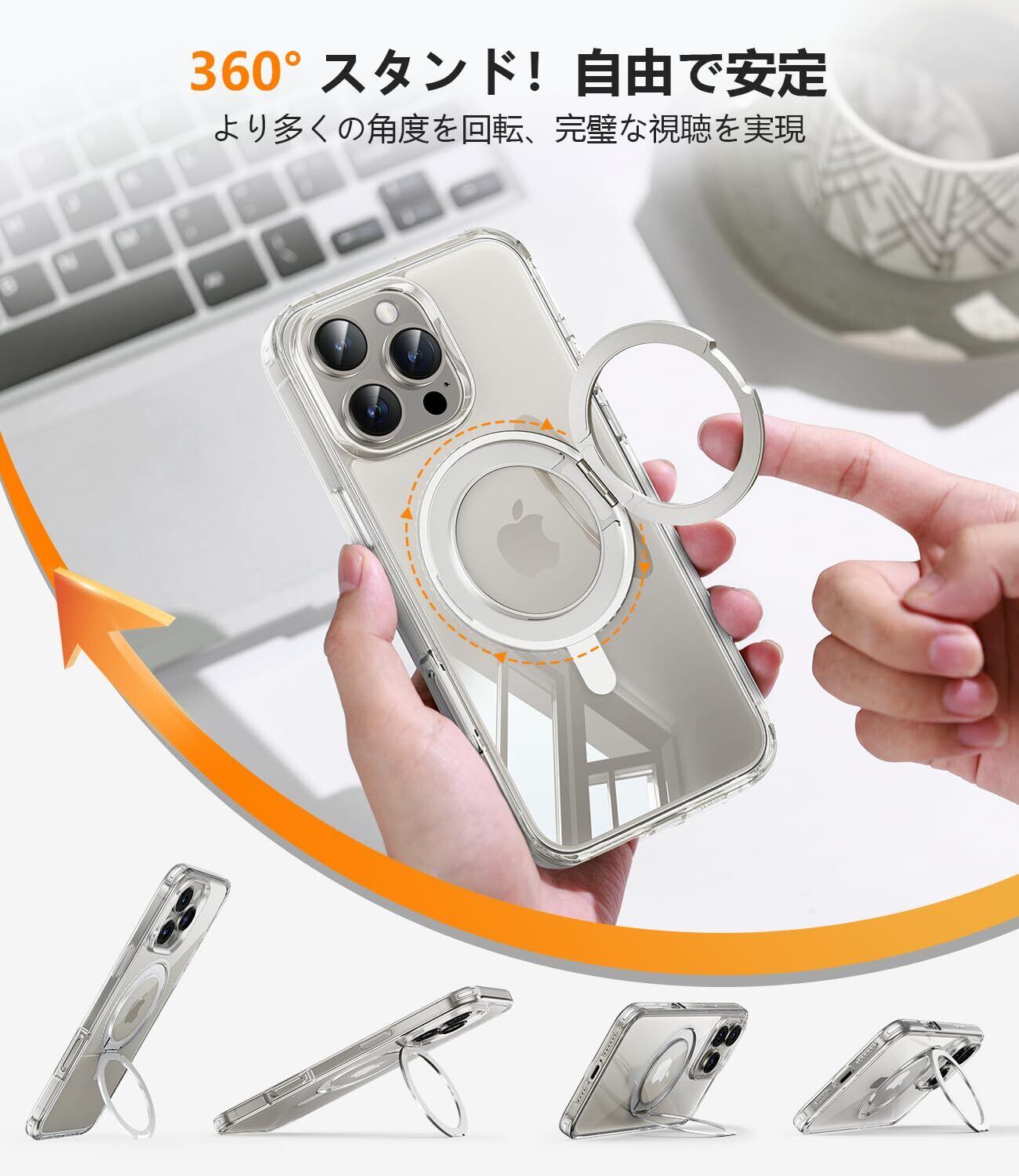 【360°回転可能なリングスタンド】: TickStandシリーズ スタンド ケース - 指先の解放神器。リングスタンドは軽量で高耐久性の航空アルミニウム合金製で、スリムな埋め込みデザインです。目に見えないスタンドを開くと、リングスタンドとして 360 度回転でき、握りやすく持ち運びが簡単です。柔軟なスタンドとして、水平方向と垂直方向に任意の角度に調整でき、手を自由にします。安定した完璧な視聴体験をもたらします。