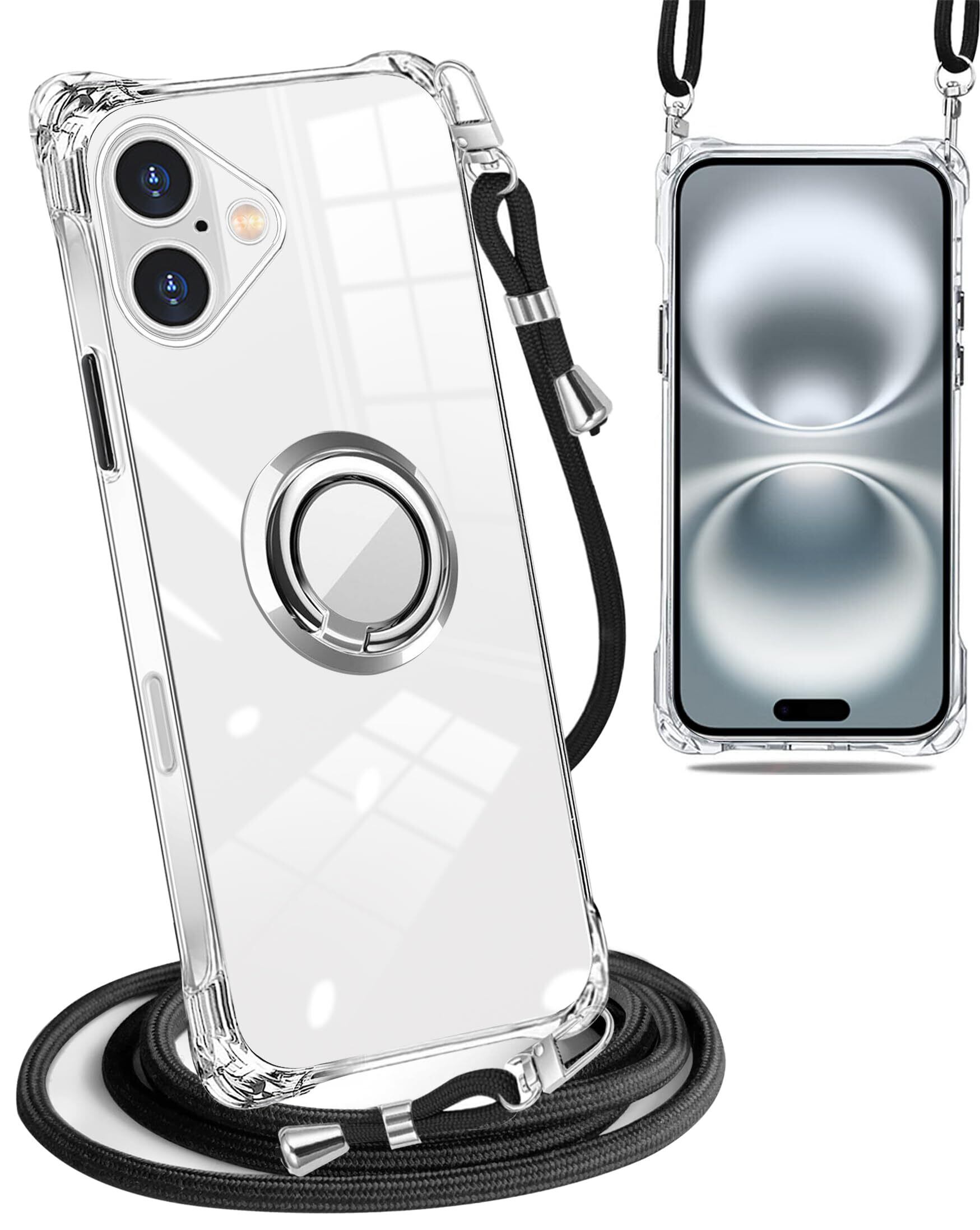 nahailun iPhone 16 ケース クリア リング付き ショルダー付き 耐衝撃 iPhone16 携帯ケース 軽量 TPU カバー ベーシック シリーズ アイフォン16 スマホケース首掛け 肩掛け 斜めがけ 付き 縦/横 2WAY 調節可能なショルダー 360°回転 スタンド機能 全面保護 車載ホルダー対応 薄型 紐付きバンパ(クリア)