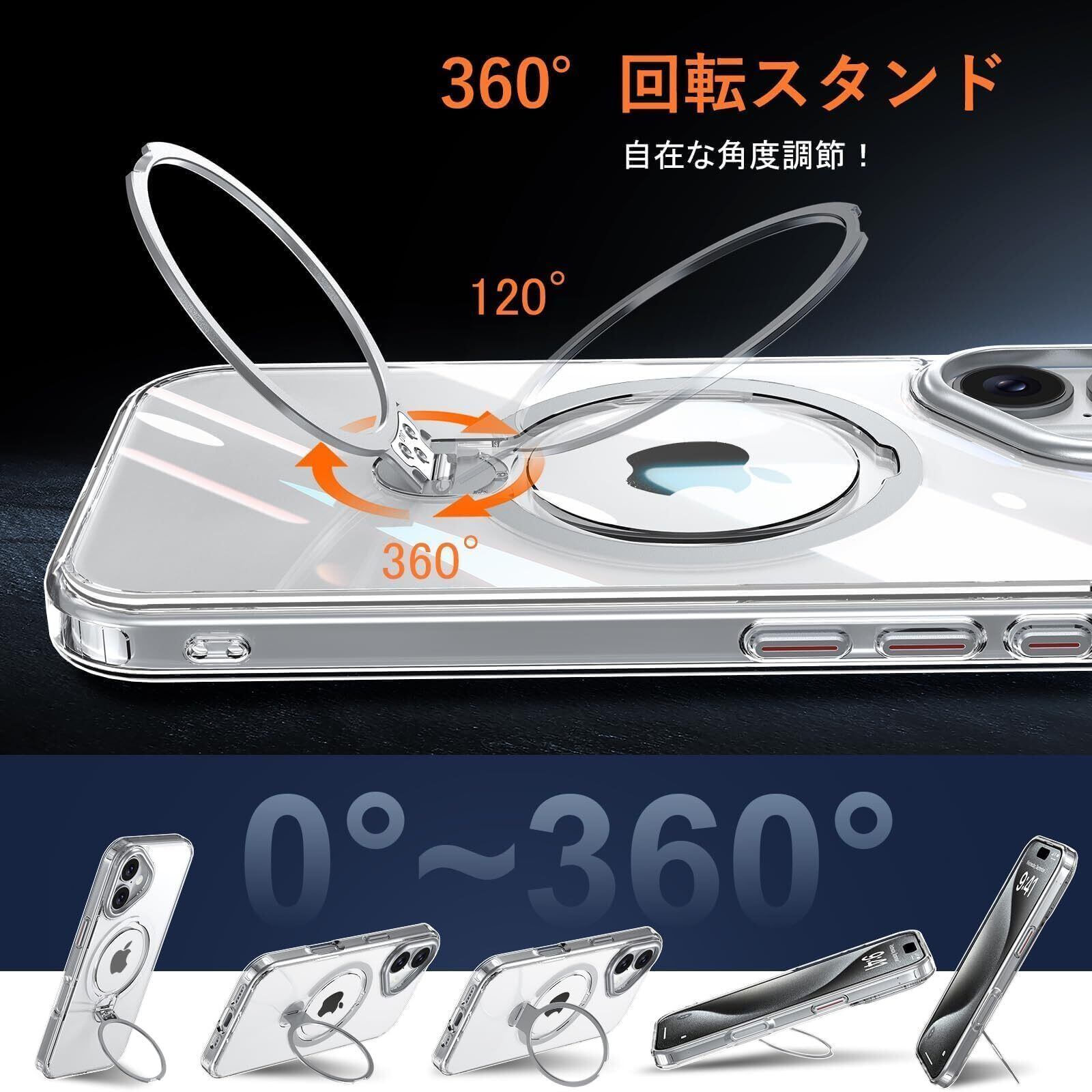 Fadkzyxr iPhone 16 用 ケース MagSafe対応 リング360°回転スタンド機能 縦横両対応 透明 黄ばみ防止 ワイヤレス充電 いphone16 スマホケース レンズ保護 米軍規格 耐衝撃 携帯カバー アイフォン 16 ケース マグネット搭載 車載ホルダー マグセーフ対応 おしゃれ クリア