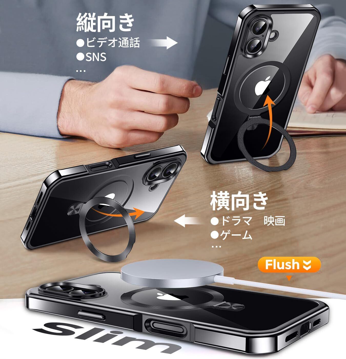 【多機能隠しスタンド・Magsafe対応+覗き見防止】WTAIYUN iPhone 16 用 ケース 全面保護 CDリング 縦横両対応 ワイヤレス充電対応 米軍 MIL規格 耐衝撃 高感度タッチ 両面 いphone16 カバー ストラップホール 付き メッキバンパー PC背面 透明 黄変防止 アイフォン16 ケース 6.1イン チ (ブラッ ク)