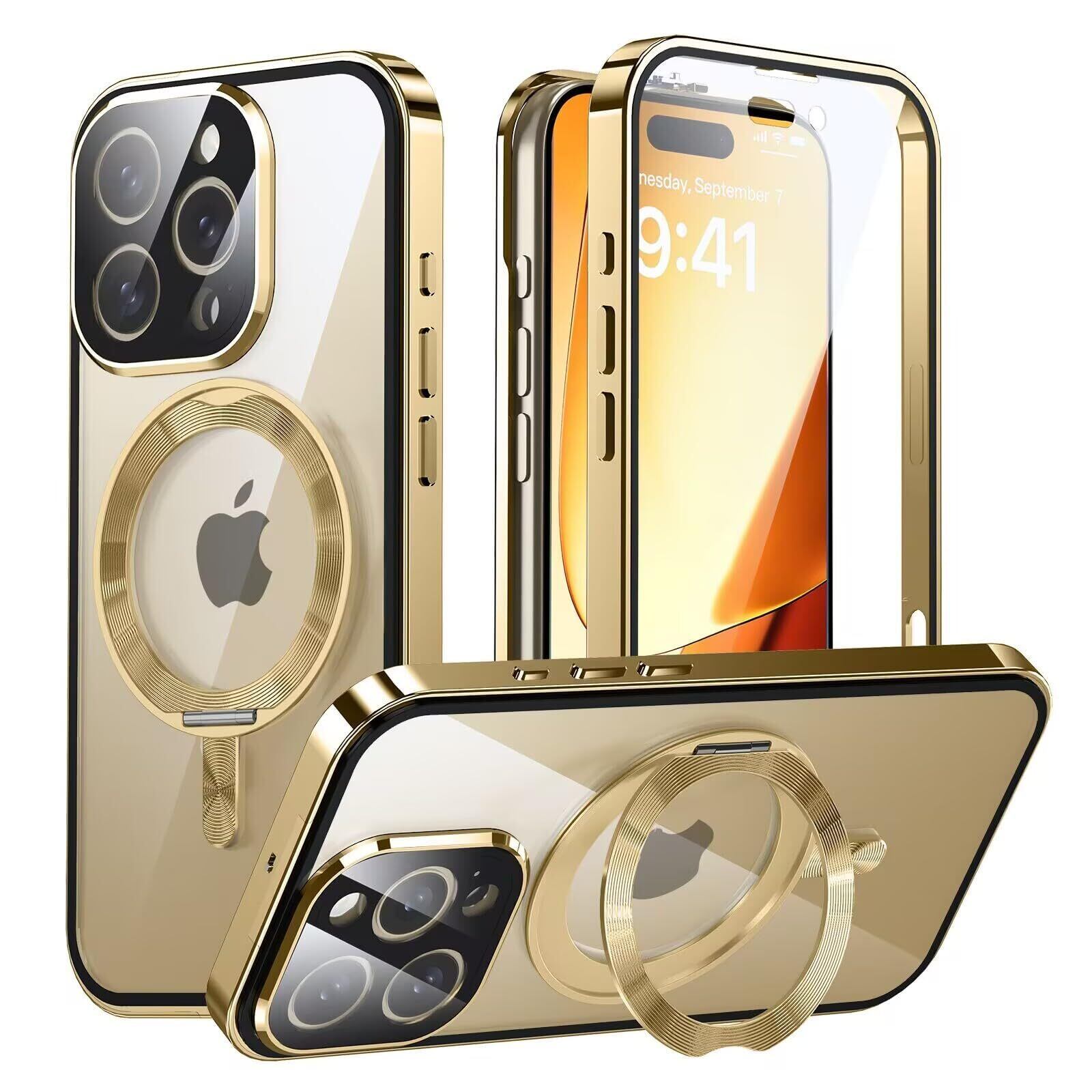 iPhone 16 Pro 用 両面 Magsafe対応 ケース アイフォン16プロ アルミバンパー 360°回転スタンド Uovon スマホケース アイホン16プロ 全面保護 カバー カメラレンズ保護 ワイヤレス充電対応 ロック機能 ・ ゴールド