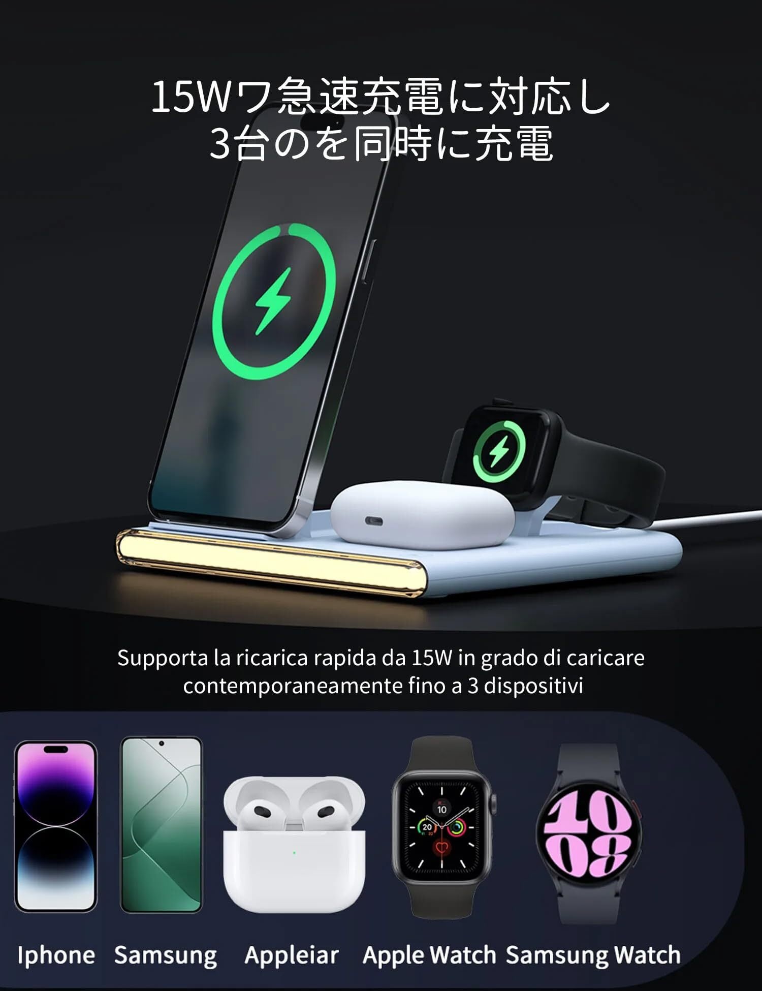 この3-in-1ワイヤレス充電器は15Wの急速充電を提供し