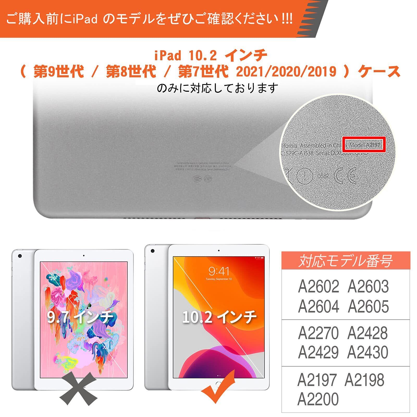 「対応機種」:iPad 第9世代/ 第8世代/ 第7世代 10.2インチ 専用のデザインです。適用型番:A2602/A2603/A2604/A2605(第9世代 2021)、A2270/A2428/A2429/A2430(第8世代 2020)、A2197/ A2198/ A2200(第7世代 2019)。※他の機種との交換性はありませんので、ご購入前にぜひご機種の型番を確認してください。