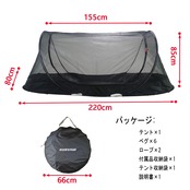 広々とした内部空間:製品のサイズは220cm(底面の長さ)*155cm(天井の長さ)*80cm(幅)*85cm(高さ)です。身長180cm、体重80kgの男性が仰向けに寝ても、余裕のある活動スペースがあります。体のどの部位も蚊帳に触れることなく、蚊に刺されることを避けることができます。