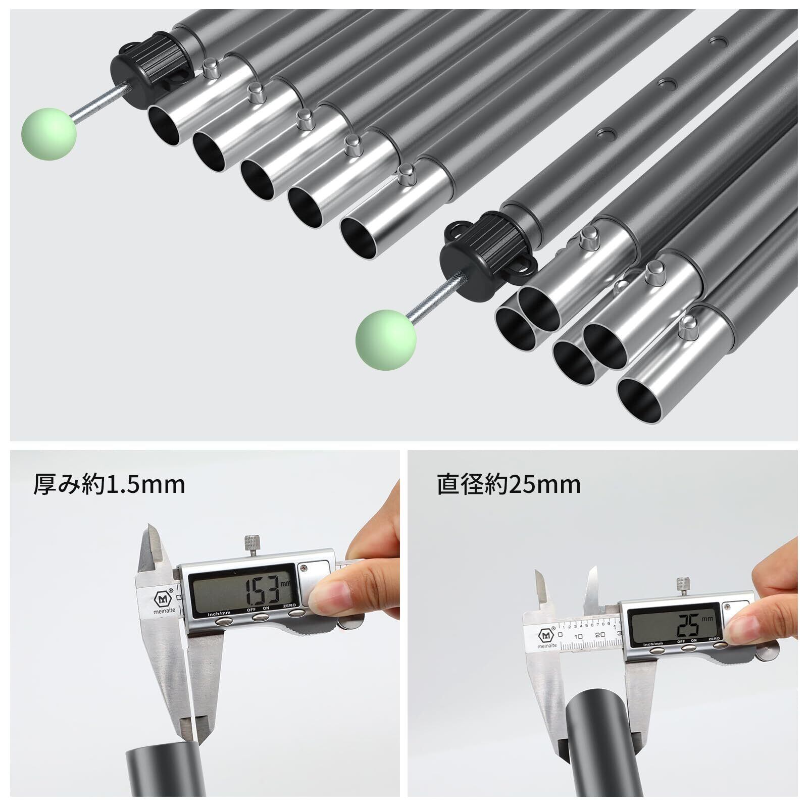 【7節分割式構造】直径25mm・厚さ1.5mm・最長240cm。分割式なので、使用後楽々に分解して保存できます。ポールの数によって、異なるタープのスタイル設営することができます。