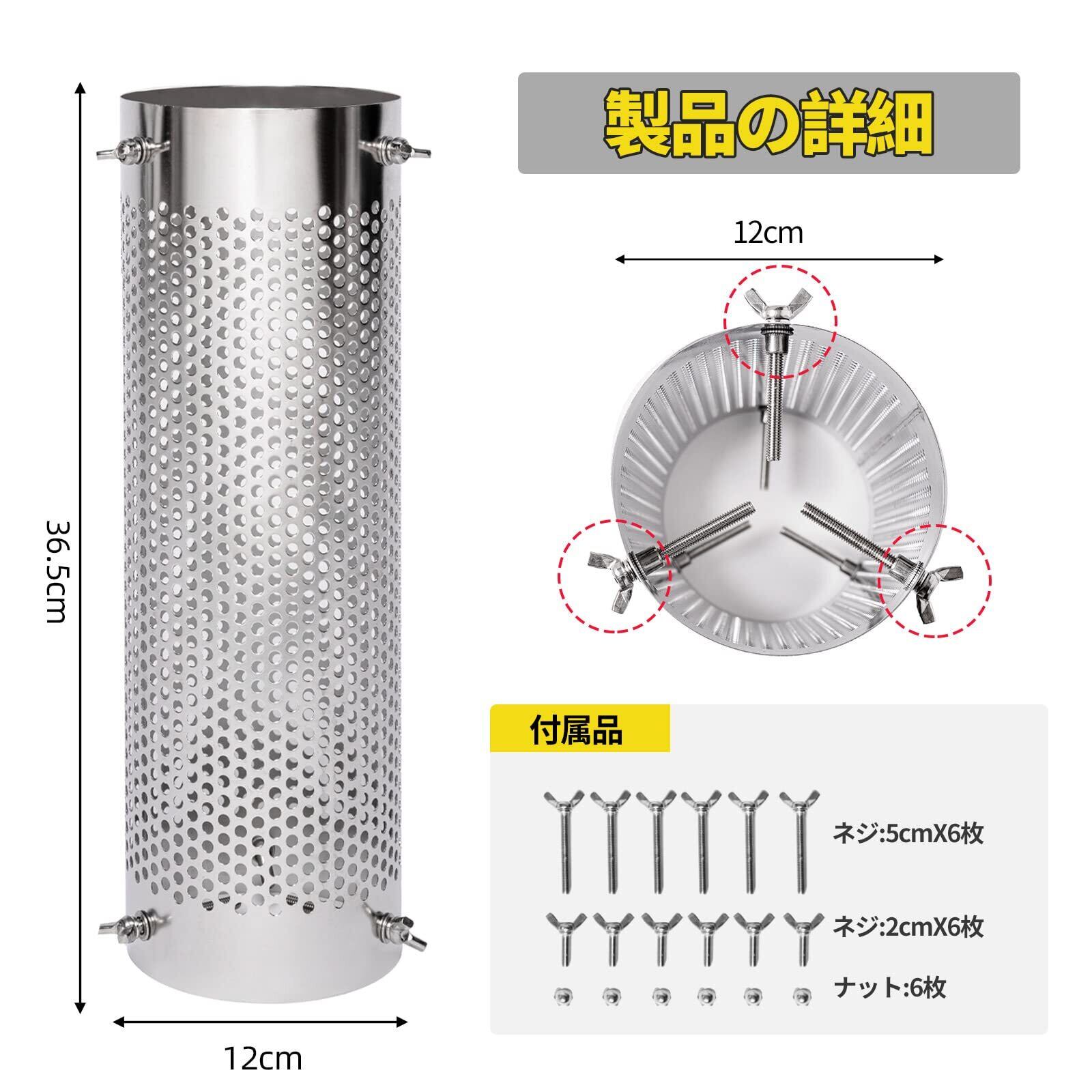 【改良版煙突ガード】:サイズ:直径(約)12 cm長さ(約)36.5 cm、重量:(約)550 g。付属品:20 mmネジ×6個 50 mmネジ×6個 ナット×6個(煙突パイプɸ50~100 mmに適合)必要に応じて適切な蝶ネジを選択し、ナットを取り付けることで煙突を摩耗から保護することができます。