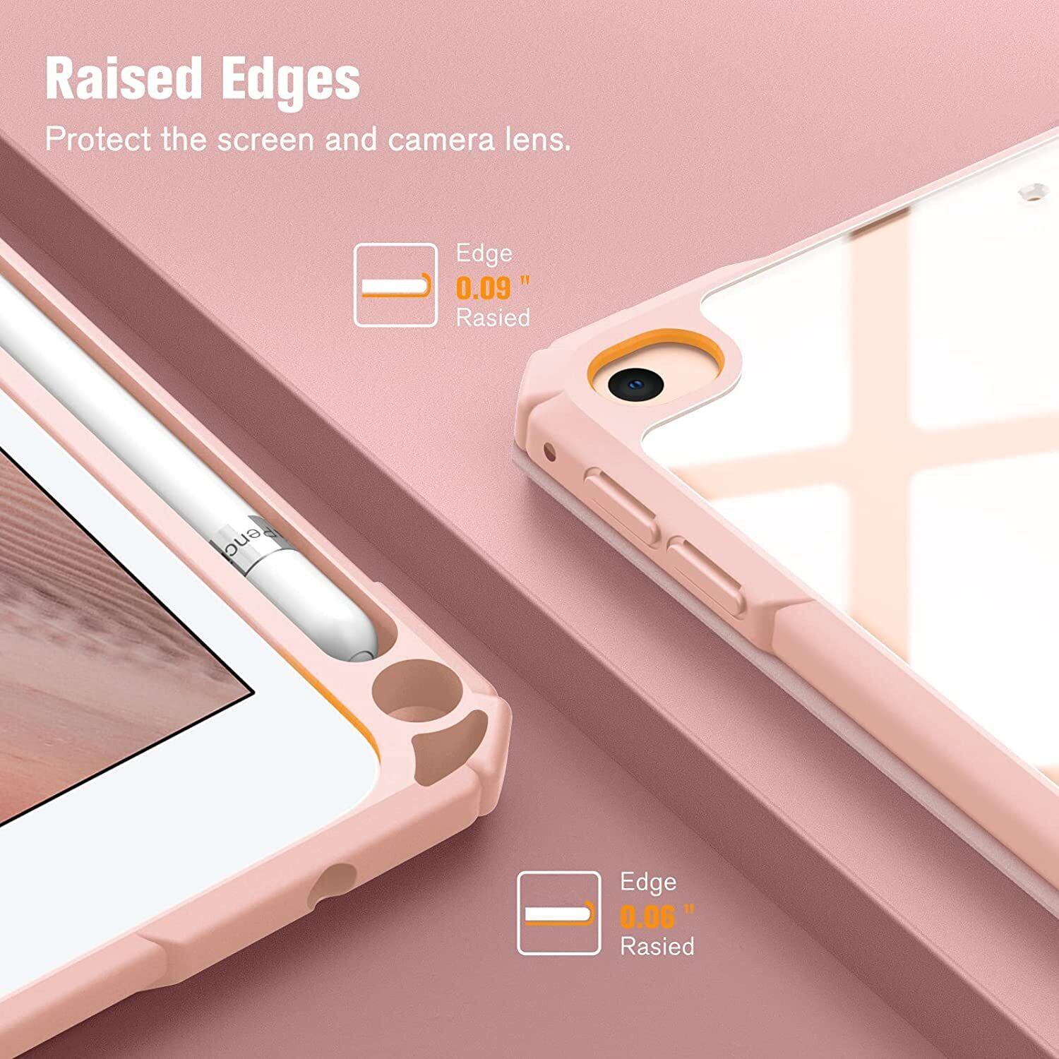 【材料・透明バックカバー】 ケースの表面はPUレザー素材を利用して、軽量、超薄を備えます。ポリカーボネート素材を採用している透明バックカバーは汚れや傷つけなどを防止するだけでなく、iPad本体の色と美しさも活かせます。透明バックカバーの枠は柔軟なTPUを採用して、取り付けも簡単にできます。フロントカバー内部材質はマイクロファイバーで、摩擦によって発生する傷を抑え、液晶画面を保護しきれいに保ちます。(ご注意:透明バックカバーには保護用のフィルムがついていますので、ご使用前に保護フィルムを剥がしてください。)