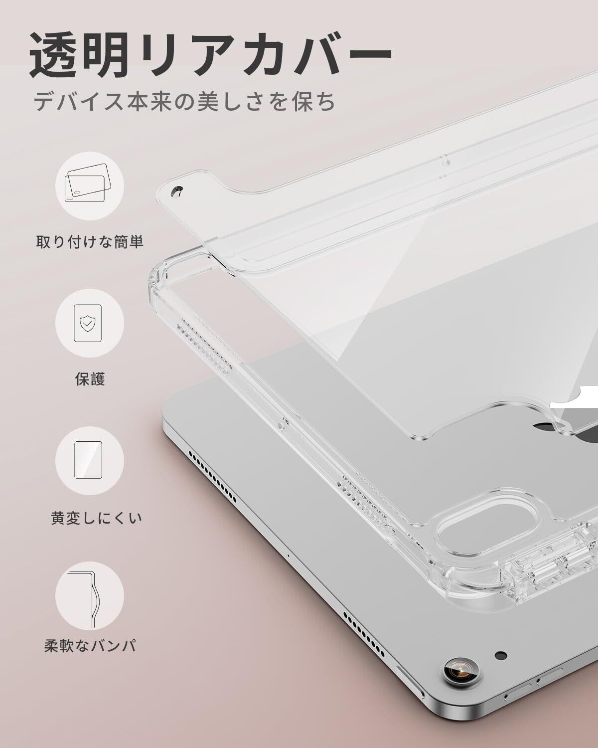 【材料・透明バックカバー】 ケースの表面はPUレザー素材を利用して、軽量、超薄を備えます。ポリカーボネート素材を採用している透明バックカバーは汚れや傷つけなどを防止するだけでなく、iPad本体の色と美しさも活かせます。透明バックカバーの枠は柔軟な TPUを採用して、取り付けも簡単にできます。フロントカバー内部材質はマイクロファイバーで、摩擦によって発生する傷を抑え、液晶画面を保護しきれいに保ちます。