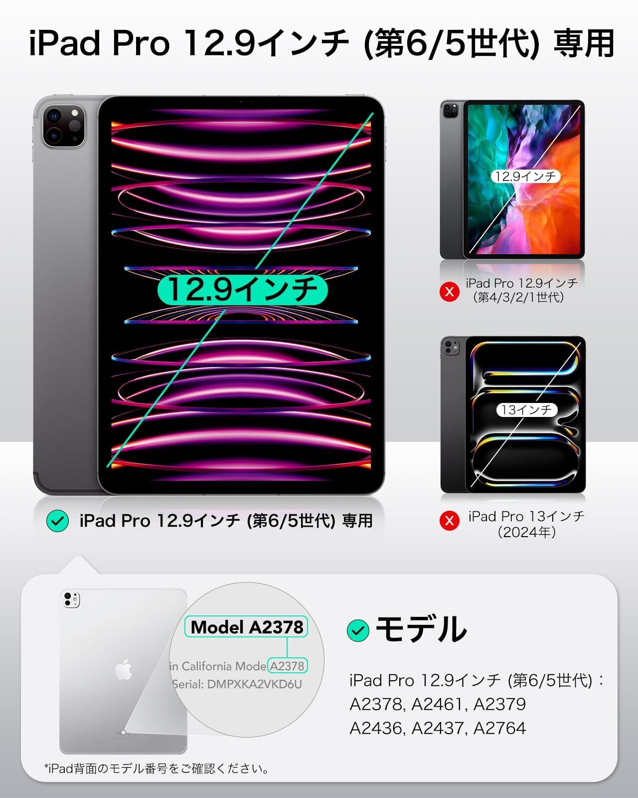 【対応機種】:iPad Pro 12.9インチ(2022、第6世代)とiPad Pro 12.9インチ(2021、第5世代)対応。モデル:A2436 A2764 A2437 A2766、A2378 A2461 A2379 A2462。ご注意:iPad Pro 12.9インチ 第4世代 2020(モデル:A2229 A2069 A2232 A2233)と第3世代 2018(モデル: A1876 A2014 A1895 A1983)には対応していません