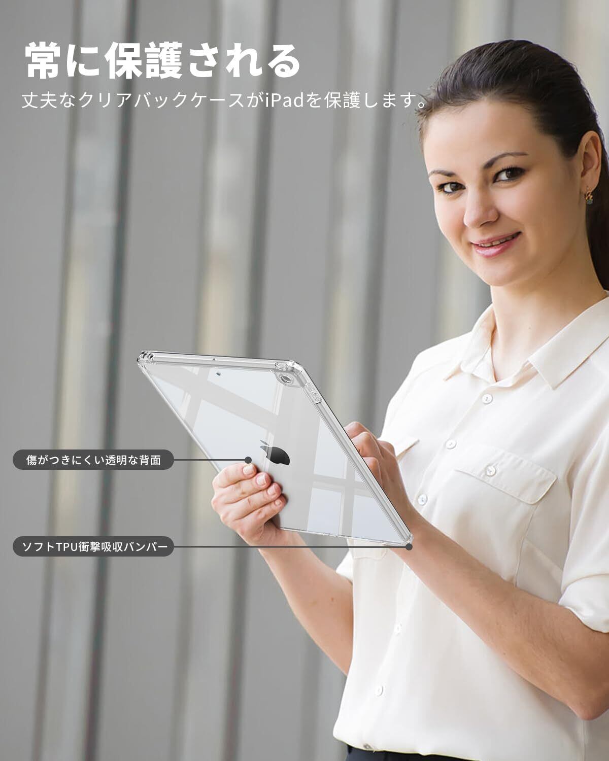 【材料・透明バックカバー】 ケースの表面はPUレザー素材を利用して、軽量、超薄を備えます。ポリカーボネート素材を採用している透明バックカバーは汚れや傷つけなどを防止するだけでなく、iPad本体の色と美しさも活かせます。透明バックカバーの枠は柔軟な TPUを採用して、取り付けも簡単にできます。フロントカバー内部材質はマイクロファイバーで、摩擦によって発生する傷を抑え、液晶画面を保護しきれいに保ちます。