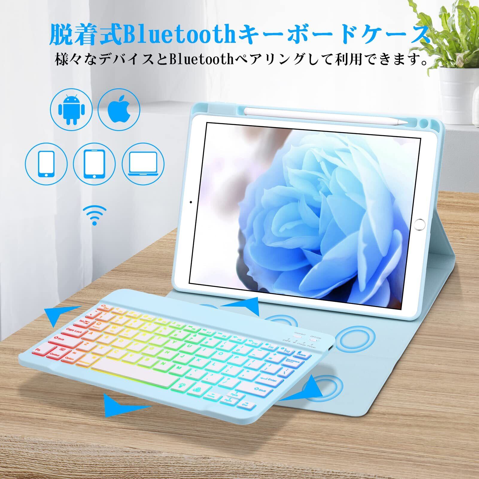 iPad 第9/8/7世代 キーボード ケース GOOJODOQ iPad 10.2 インチ 7色バックライト付き キーボード ケース 脱着式 Bluetoothキーボード付きカバー 内蔵ペンホルダー 超滑り止め 角度調整 全面保護 2019/2020/2021 iPad 10.2インチ通用(ブルー)