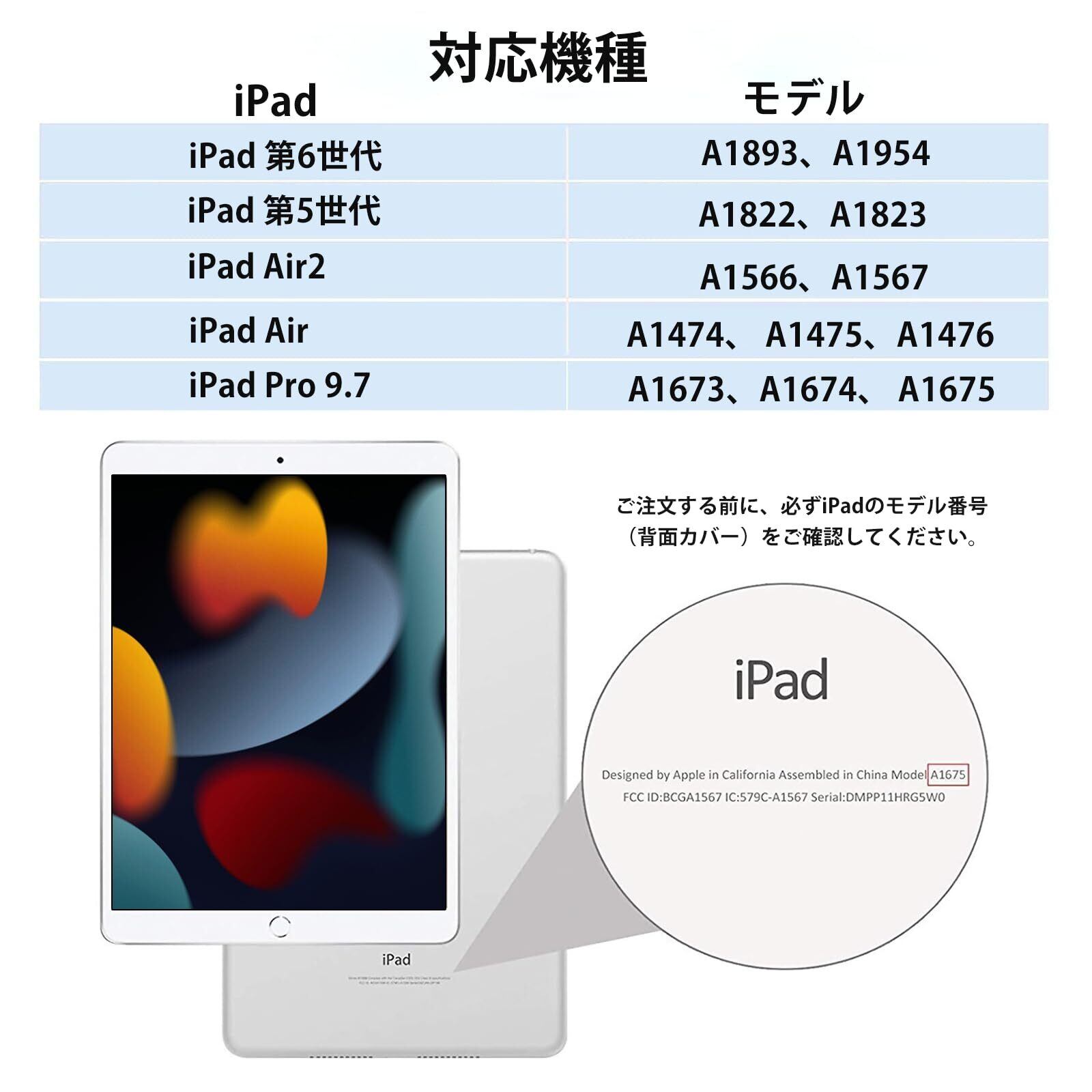 ☑【多機種対応】iPad 9.7インチ5機種対応:☀iPad 9.7 第6世代(2018年 発売モデル:A1893/A1954)☀iPad9.7 第5世代(2017年 発売モデル:A1822/A1823)☀iPad Pro9.7(モデル:A1673/A1674/A1675)☀iPad Air(モデル:A1474/A1475/A1476)☀iPad Air 2(モデル:A1566/A1567)。他のiPadモデルと互換性がありません、ご購入する時は必ずお手元のiPad裏面のモデル番号をご確認ください。 キーボードはAndroid、IOS、WindowsシステムのiPadやPC、スマホにも使用可能で、ご必要に応じて対応できます。