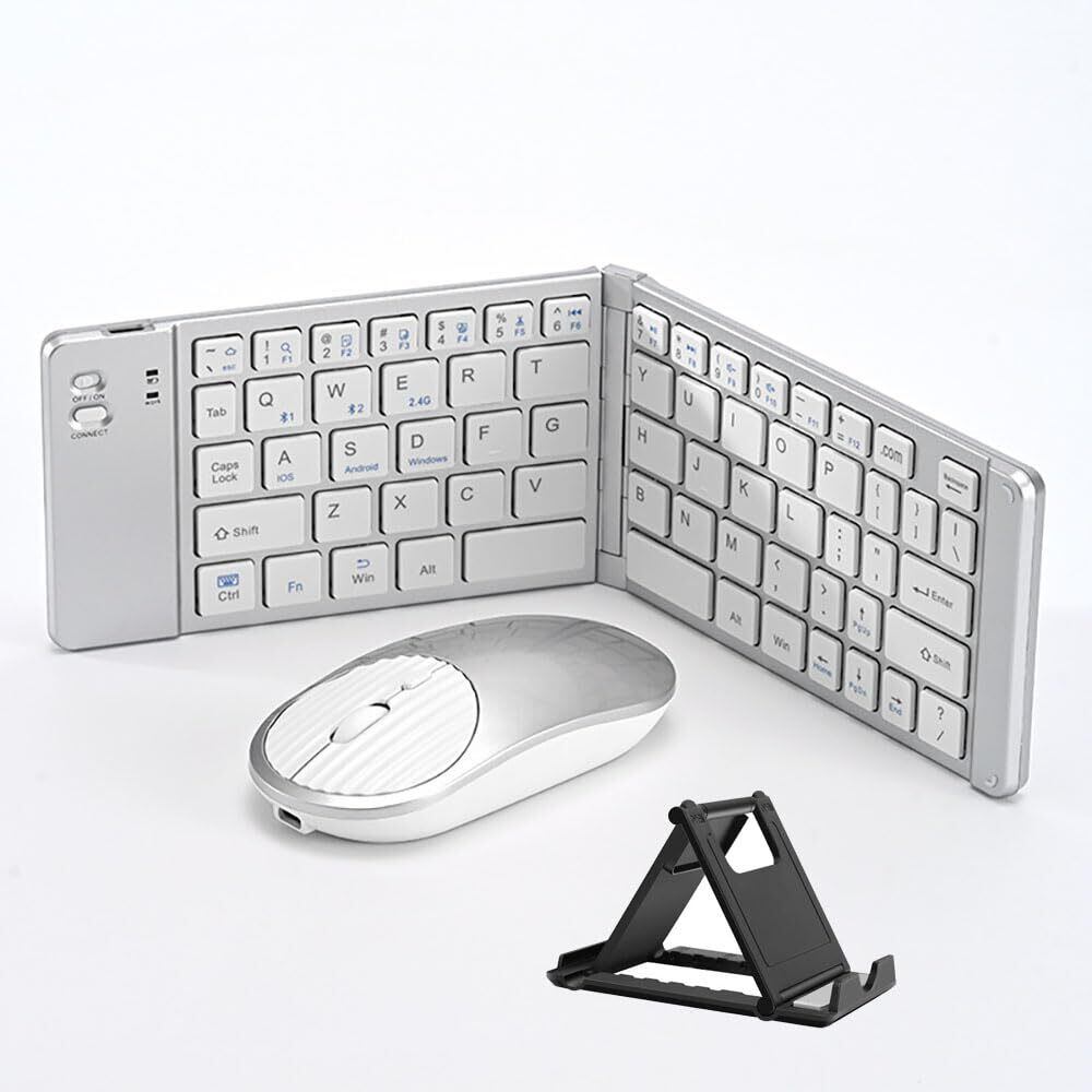 【マルチ接続・2.4GHz&BLuetooth】折り畳みキーボードマウスセット ワイヤレス 超軽量 マルチペアリング 3台デバイス対応 Type-C充電式 折りたたみキーボード ブルートゥース コンパクト 小型 携帯便利 英語配列 Windows iOS Android対応 iPad/ノートPC/パソコン/タブレット/スマホ用bluetooth キーボード マウス(銀色), シルバー