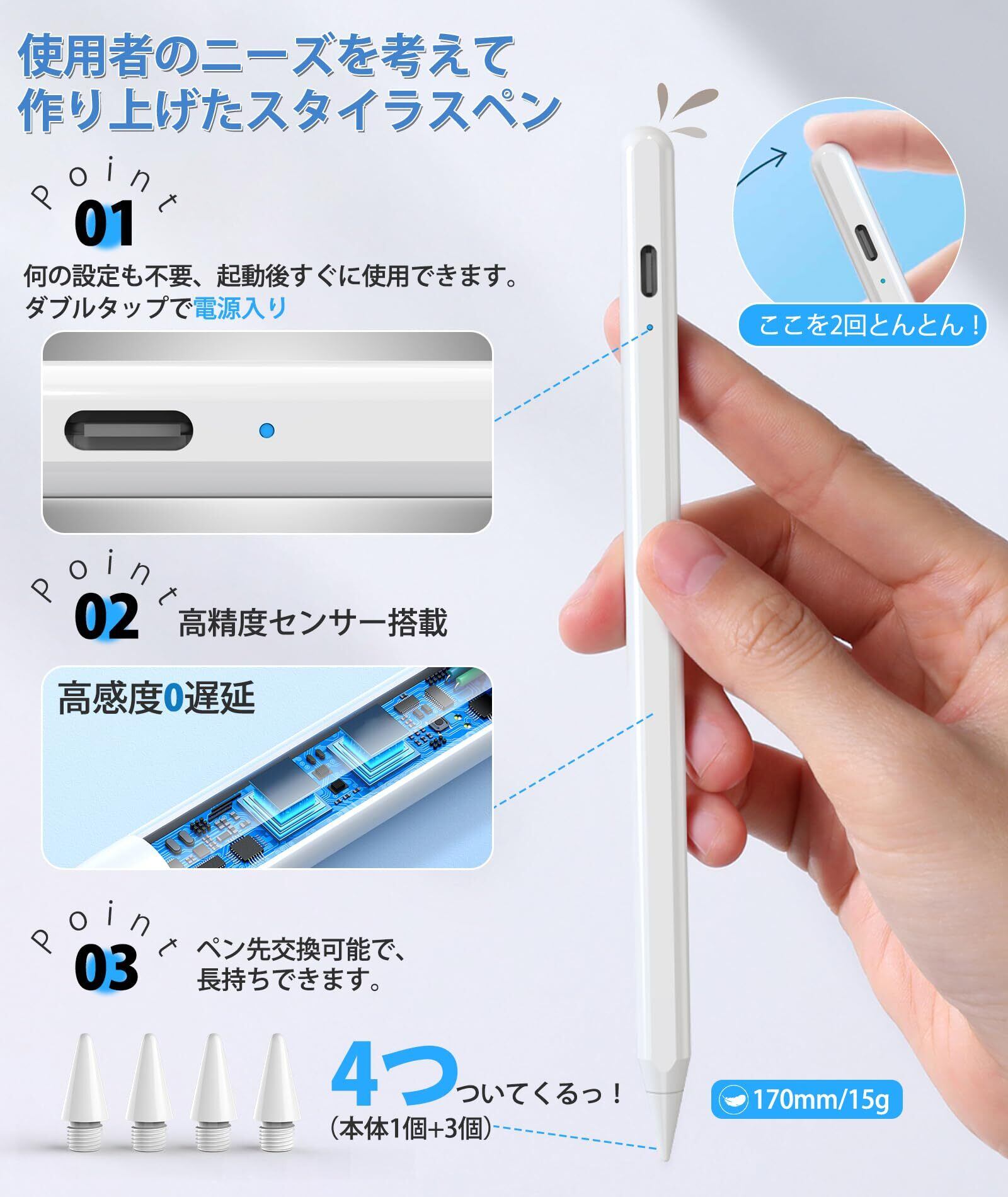 【幅広い交換性・パッケージ内容】2018年以降発売のiPadモデル対応: iPad(第6/7/8/9/10世代)、iPad mini (第5/6世代)、iPad Air(第3/4/5世代)、iPad Pro 11インチ(第1/2/3/4代)、iPad Pro 12.9インチ(第3/4/5/6世代)。【2024年新型iPad Air M2、iPad Pro M4に対応不可】パッケージ:iPadタッチペン*1、USB-C充電ケーブル*1、交換用ペン先*3、英日取扱説明書*1。