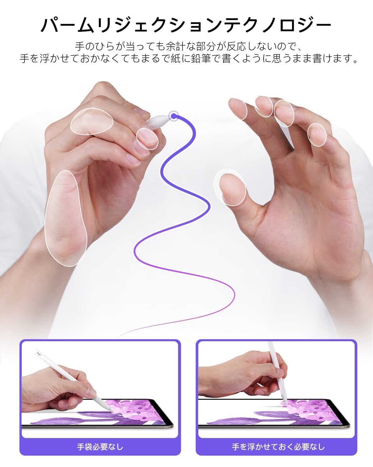 ★【ペアリングと充電自動&書き心地がよい】iPadの右側面にある磁気コネクタにくっつけて自動的にペアリング完了と充電始め、手動でペアリングが必要ないです。ペン先は純正Apple Pencilと互換性ある超耐摩耗性のペン先で、精度感度耐摩性が改良されて、ピクセルレベルの精密さと感じられないくらい微小なタイムラグを持ち、遅延も誤差もなくて、小さい文字でも書けて繊細な表現が可能です。滑らかな先端は、デバイスとの摩擦を減らし、画面を損傷しません。鉛筆のように簡単で自然に使用できます。