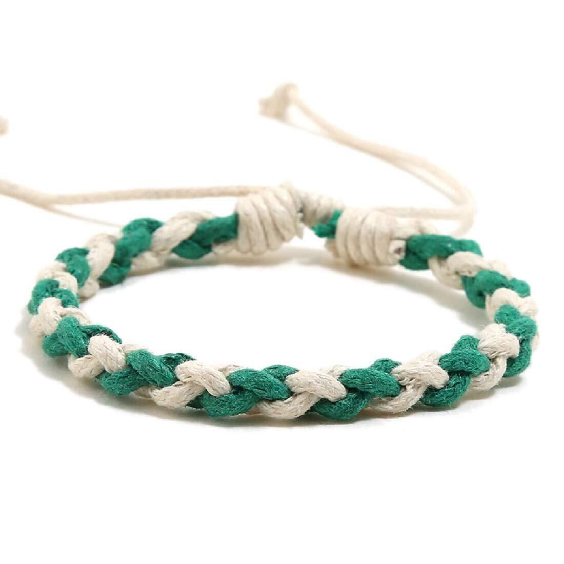 【編み込みブレスレット】Deelfelの編み込みブレスレットは、シンプルでありながらも個性的なデザインが特徴です。ホワイトと緑色の紐が交互に編み込まれたデザインで、さりげないおしゃれを演出します。