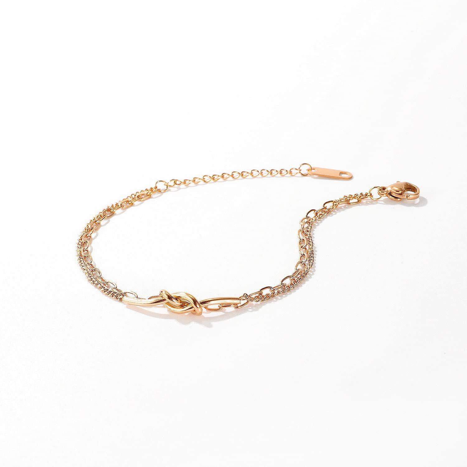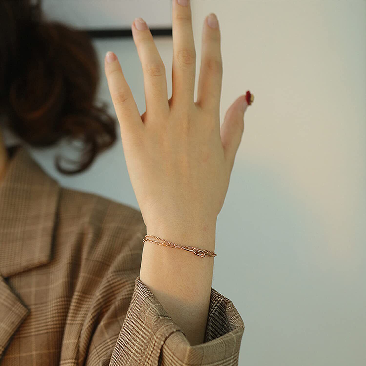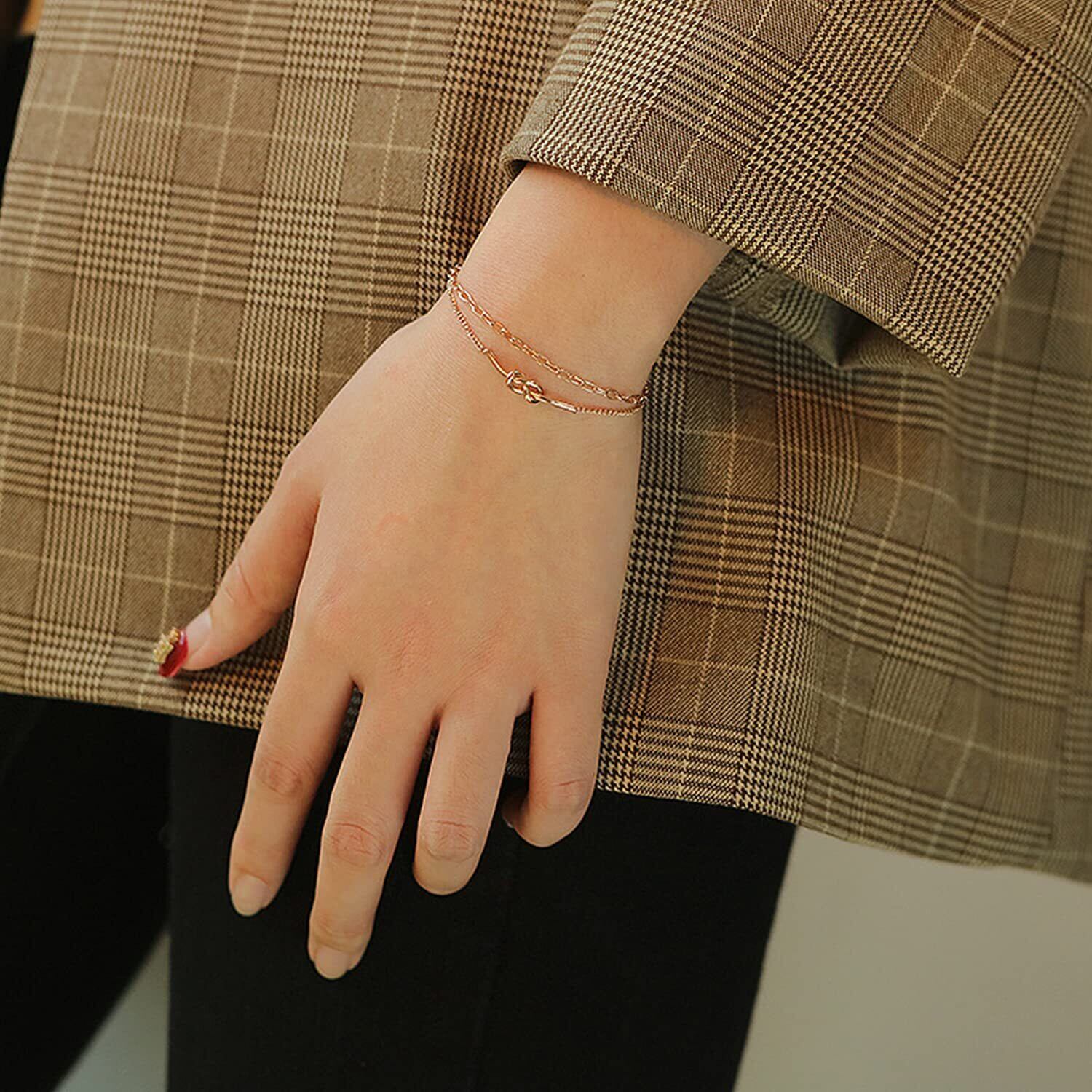 Rockyu ブレスレット レディース ピングゴールド 結び 18金メッキ 2連チェーン ブレスレット シンプルファッション サイズ調整可能 チタン製腕輪 ブレスレット 女性 人気 ジュエリー