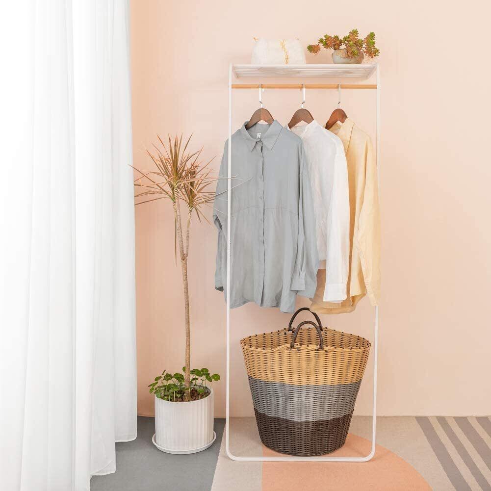 「抜群な収納力」三つの収納スペースが活用できます。パイプ部分はワンーピース、洋服、コートなど様々の衣類が十分に掛けられます。上の棚にはバッグと帽子など小物が一緒に収納できるし、植物や好みの絵等も飾れて部屋をきれいに見えます。下には46cm幅の空き空間があるので、収納ボークス、カゴを置けば、また収納スペースとして使えます。