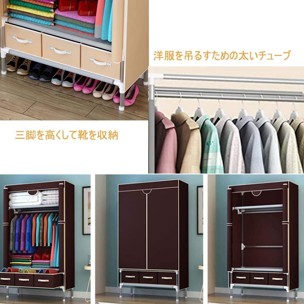 ワードローブカバー付き ワードローブクローゼット 洋服ダンス メタルラック ハンガーラック大容量 シンプルな布製ワードローブ 引き出し三つ付き 防塵 耐用(ブラウン)