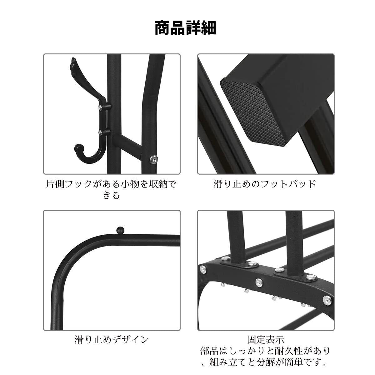 【製品仕様】 商品サイズ:幅110cm×奥行33cm×高さ148cm/ 製品重量:4.76KG / 主要材質:メタル、カラー:ブラック・ホワイト 耐荷重は30kgで、大量の洋服を収納できます。