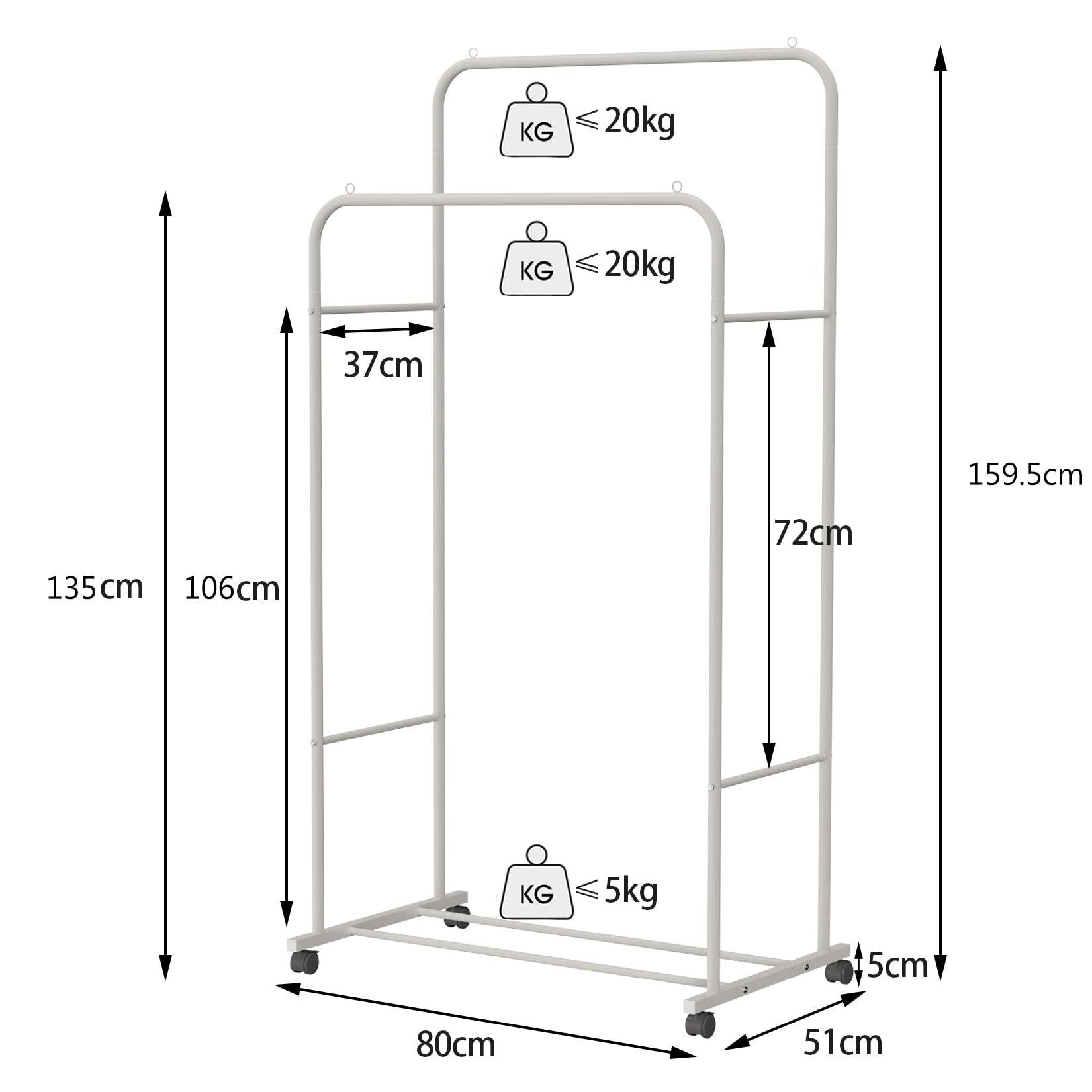 UNHO ハンガーラック 2段 パイプハンガー ダブル 洋服ラック キャスター付 白 大容量 服掛け スタンド おしゃれ パイプハンガー ラック 防サビ加工 棚付き 衣類 収納 室内物干し 幅80x高さ155cm