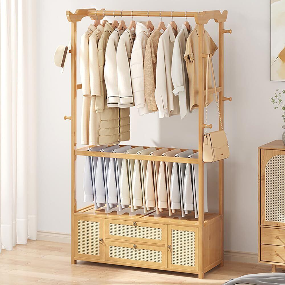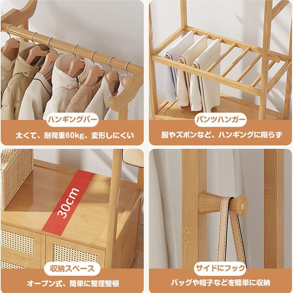 Fuyutu ハンガーラック 引き出し付き スリム 大容量 省スペース 幅100×奥行30cm ワードローブ 軽量 多機能収納 組立簡単 天然竹製 コートハンガー 収納ラック 衣類ラック 洋服掛け 洋服ラック 室内 寝室 部屋 (ナチュラル, 幅100cm)