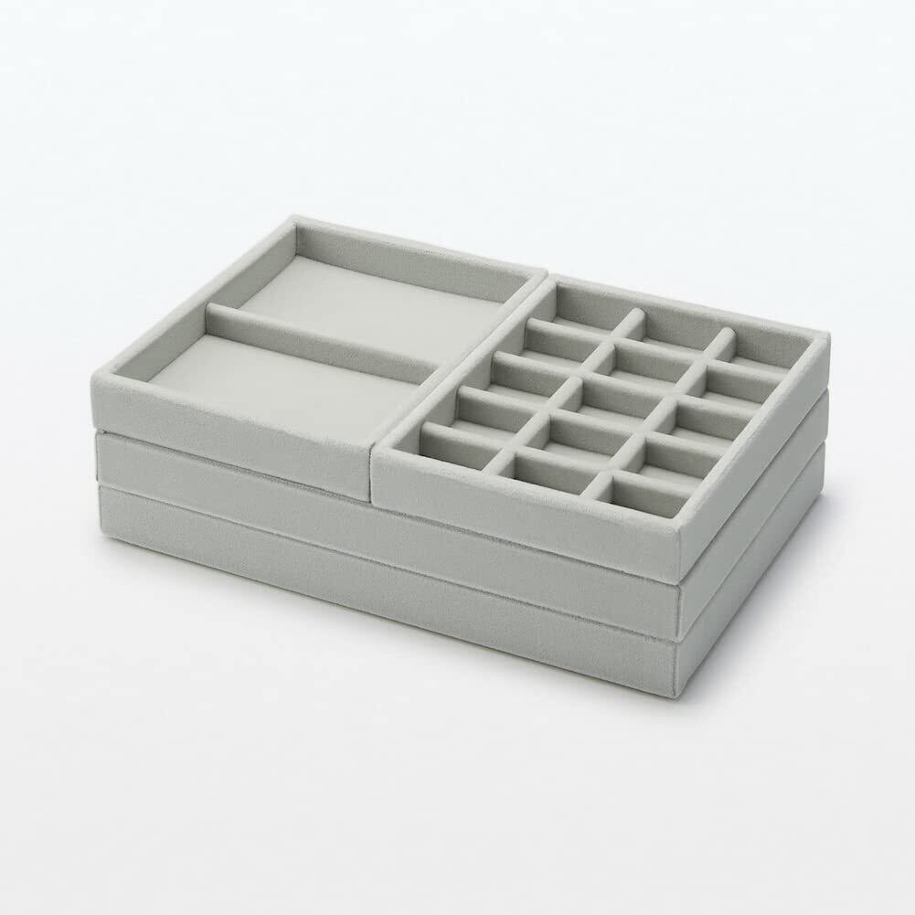 そのまま単体で使っても、上下積み重ねても、別売りの重なるアクリルケースに入れても使える、アクセサリーや腕時計の収納に適したケースです。手触りがやわらかなベロア地で、ガラス素材のアイテムなども傷つけずに収納できます。引出・大サイズに2つ入り、「ベロア内箱仕切・格子」とも組み合わせ可能です。※積み重ねの目安は5段まで。